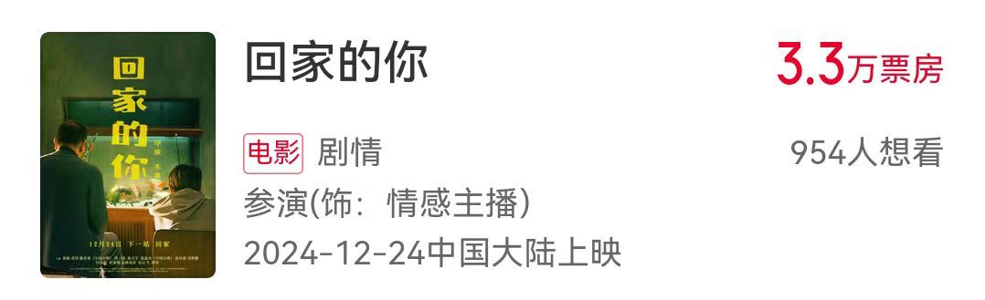 在写一篇东北喜剧人的稿子,无意间查到了范伟老师今年参演了一部电影叫「回家的你」,一看上映日期12月24日,这都上映了啊,一看票房3.3万……没错,3.3万……
