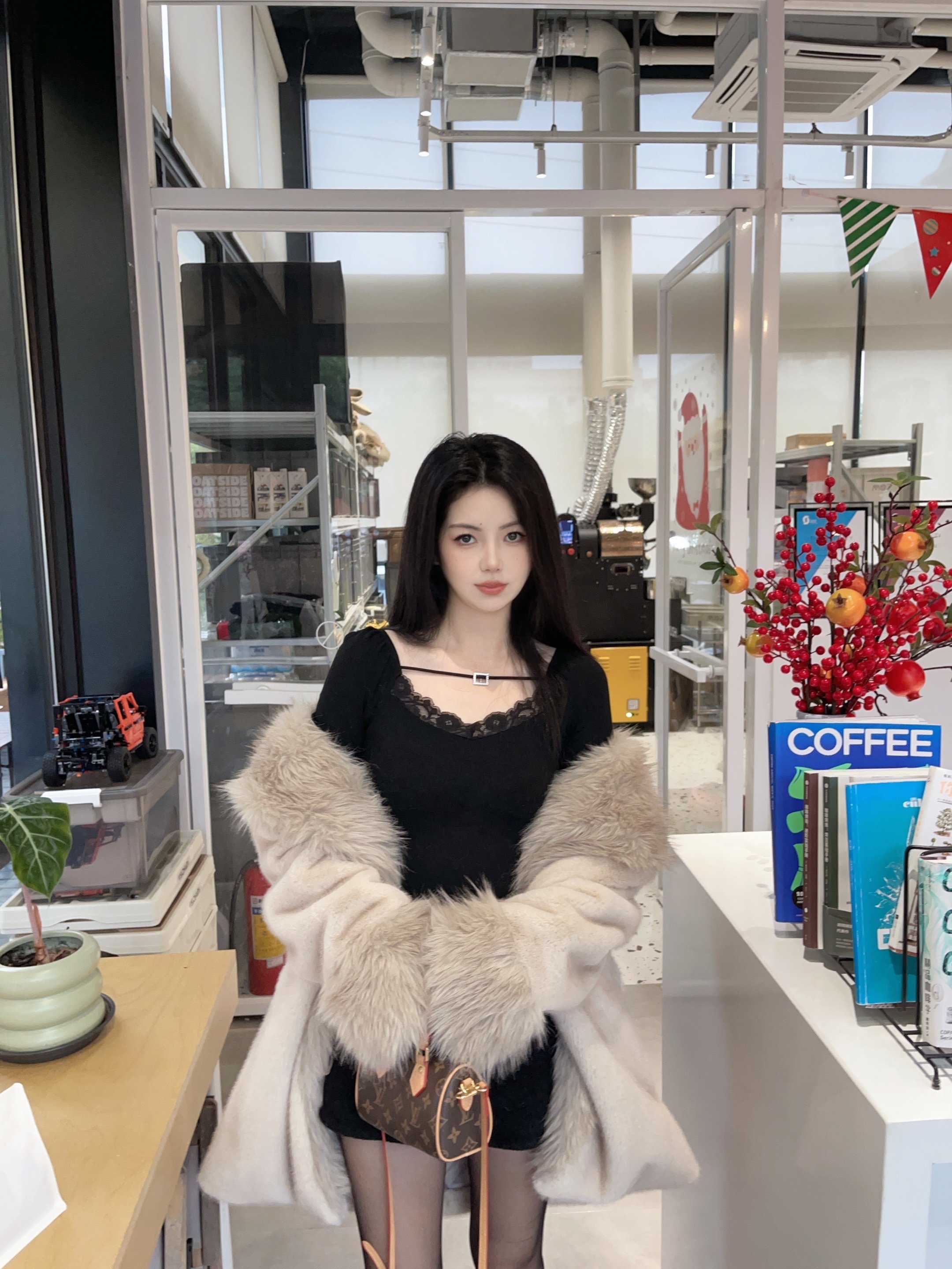 黑色蕾丝内搭长袖T恤v领性感御姐斜肩上衣