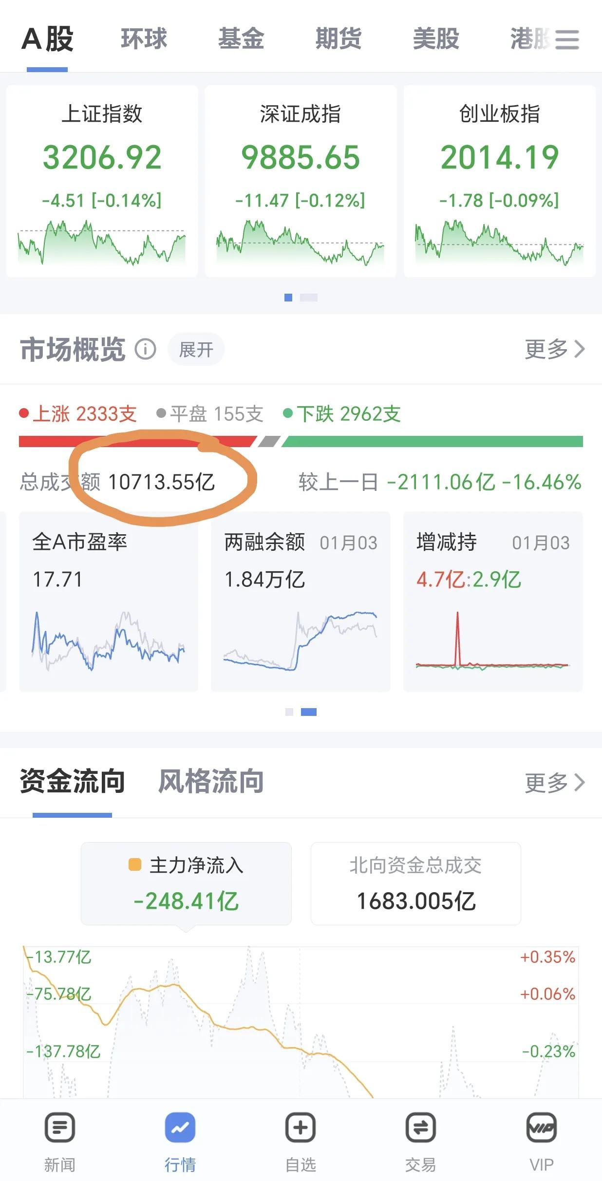 A股成交量今天跌至1.07万亿,大概率就两种走势一个是接下来2-3个交易日放量到1.2万亿反弹。然后再跌破1万亿开始慢慢阴跌。另外一个就是明天继续直接开始阴跌破1万亿。套着的没办法,生死自己决定,啥时候还会出政策,又会像9.24一样,把10-12月的再演一遍。