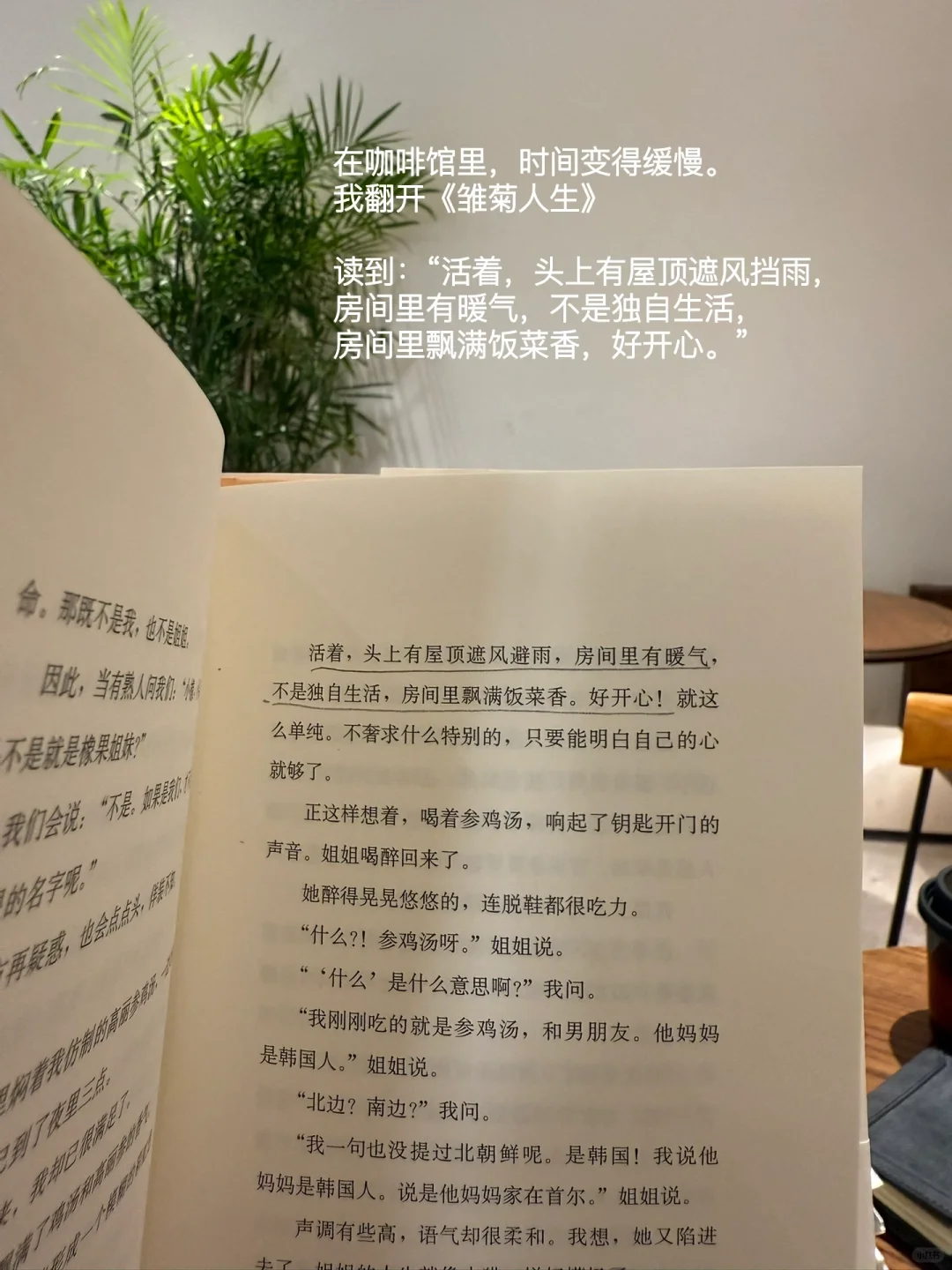我翻开《雏菊人生》,读到:“活着,头上有屋顶遮风挡雨,房间里有暖气,不是独自生活,房间里飘满饭菜香,好开心。”
