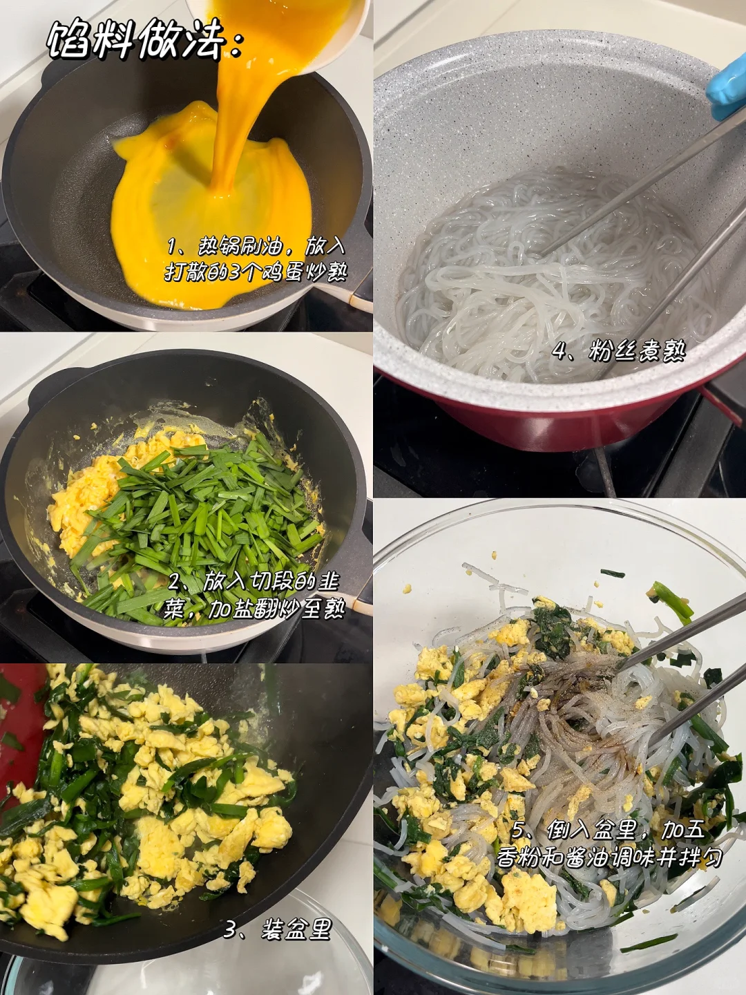 鸡蛋3个、粉条适量、韭菜适量、盐、五香粉、酱油