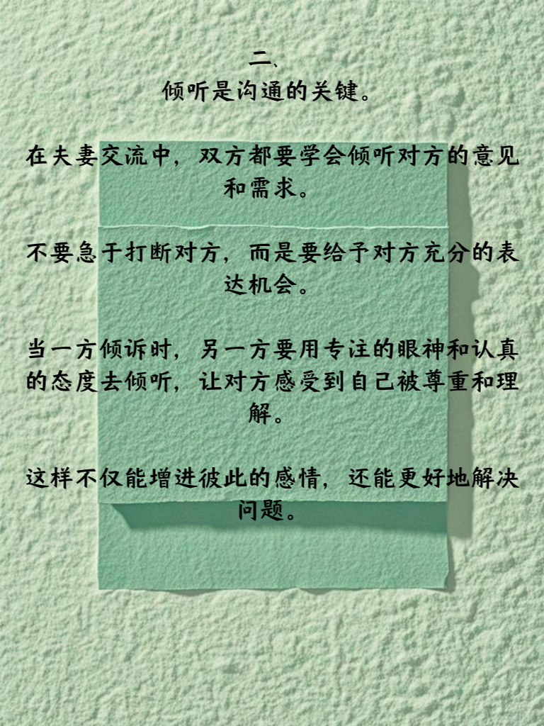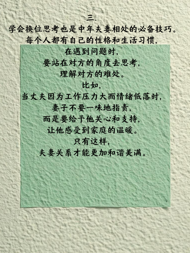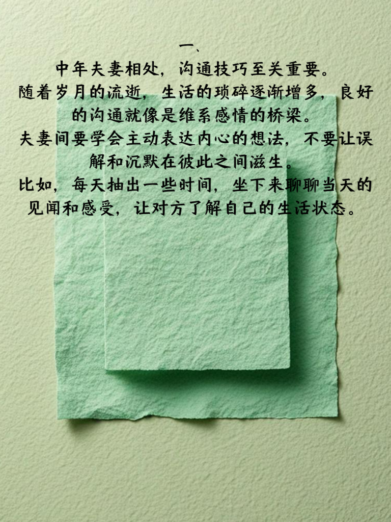一、中年夫妻相处,沟通技巧至关重要。随着岁月的流逝,生活的琐碎逐渐增多,良好的沟通就像是维系感情的桥梁。夫妻间要学会主动表达内心的想法,不要让误解和沉默在彼此之间滋生。比如,每天抽出一些时间,坐下来聊聊当天的见闻和感受,让对方了解自己的生活状态。 二、倾听是沟通的关键。在夫妻交流中,双方都要学会倾听对方的意见和需求。不要急于打断对方,而是要给予对方充分的表达机会。当一方倾诉时,另一方要用专注的眼神和认真的态度去倾听,让对方感受到自己被尊重和理解。这样不仅能增进彼此的感情,还能更好地解决问题。 三、学会换位思考也是中年夫妻相处的必备技巧。每个人都有自己的性格和生活习惯,在遇到问题时,要站在对方的角度去思考,理解对方的难处。比如,当丈夫因为工作压力大而情绪低落时,妻子不要一味地指责,而是要给予他关心和支持,让他感受到家庭的温暖。只有这样,夫妻关系才能更加和谐美满。