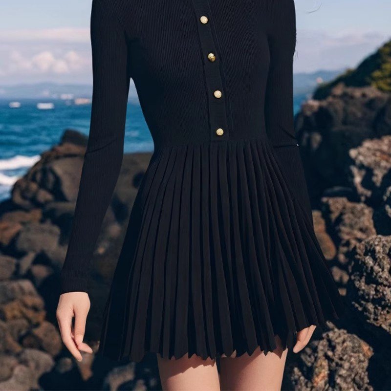 👗 神秘又优雅的黑色针织百褶连衣裙
