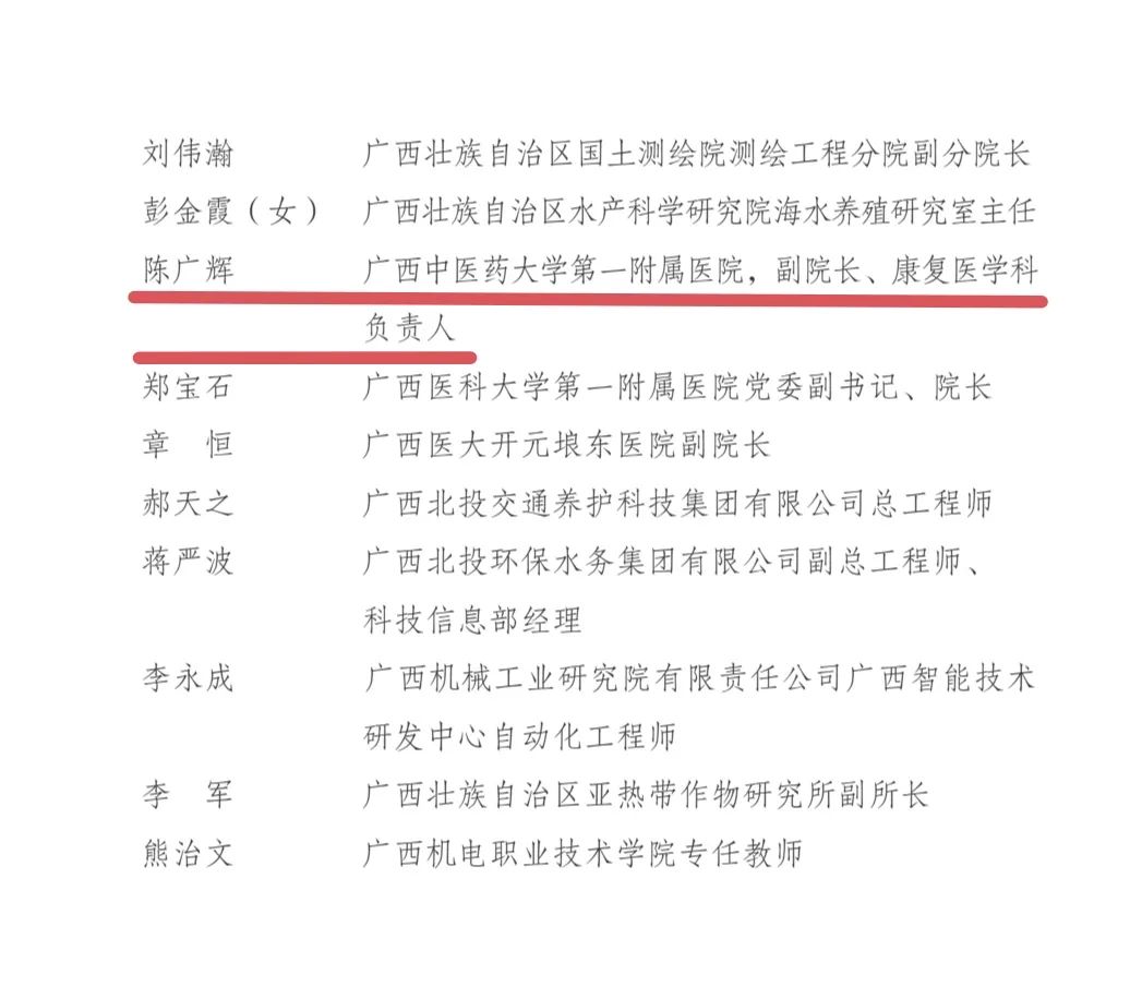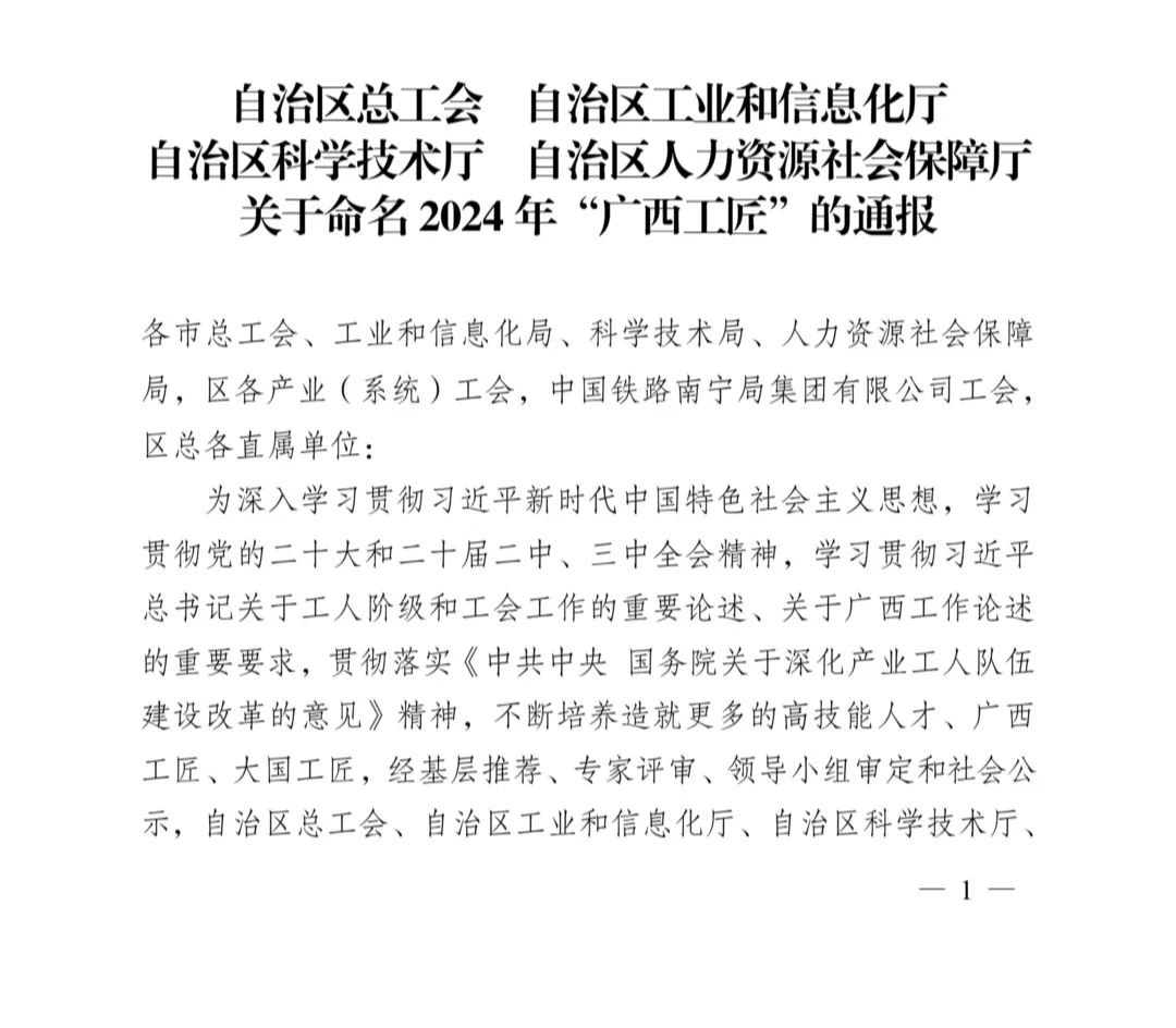 近日,《自治区总工会自治区工业和信息化厅自治区科学技术厅自治区人力资源社会保障厅关于命名2024年“广西工匠”的通报》决定命名40名同志为2024年“广西工匠”。广西中医药大学第一附属医院陈广辉同志荣获“广西工匠”称号。