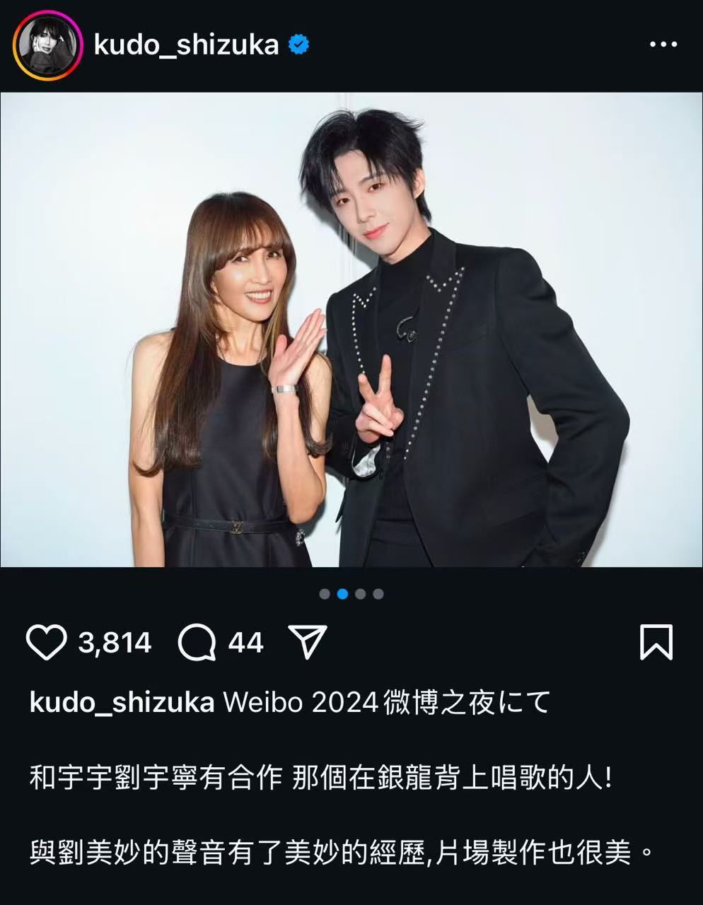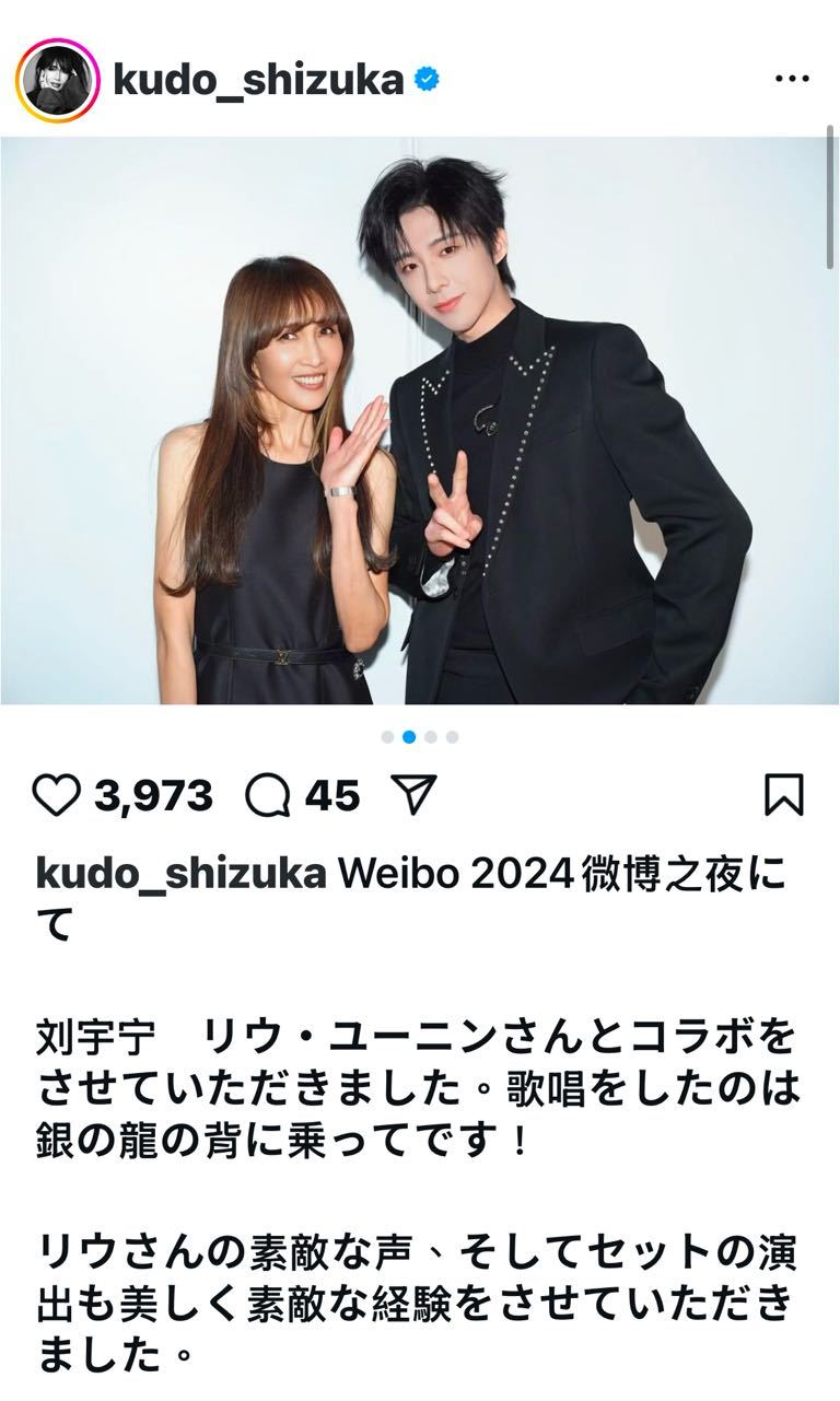工藤静香老师说,“这次和刘宇宁先生共同合作,一起演唱了〔骑在银龙的背上〕刘宇宁先生的歌声想当精湛,这次的演出是一段很完美的合作经验”!