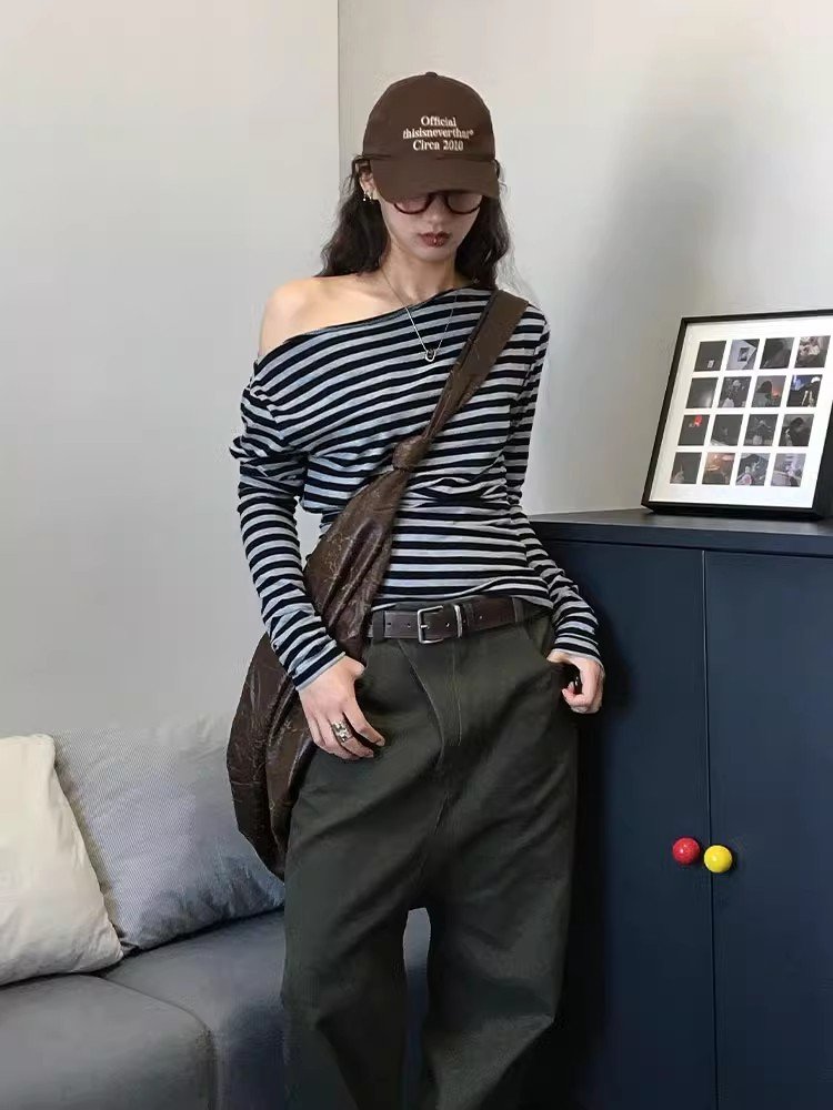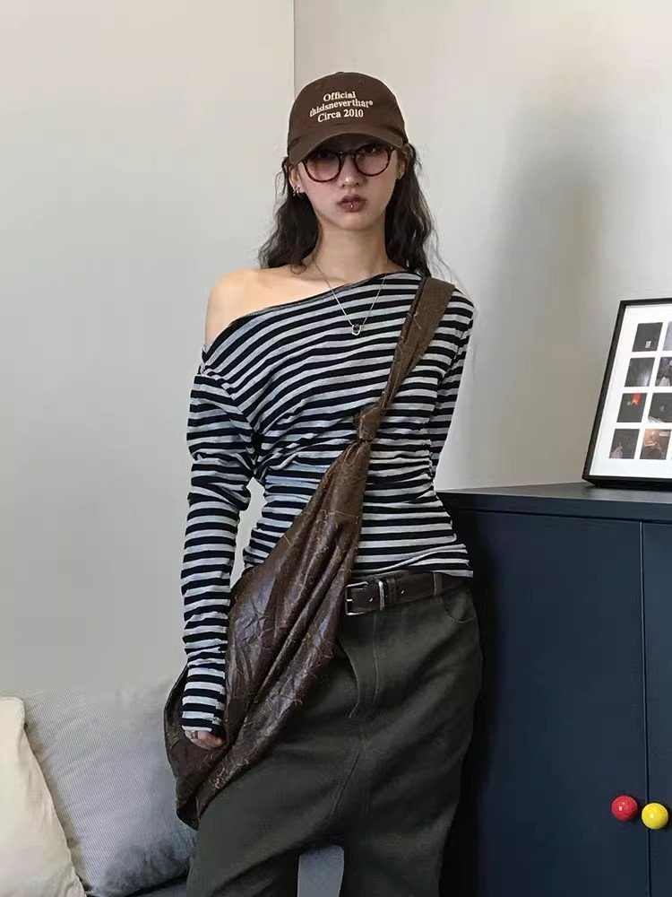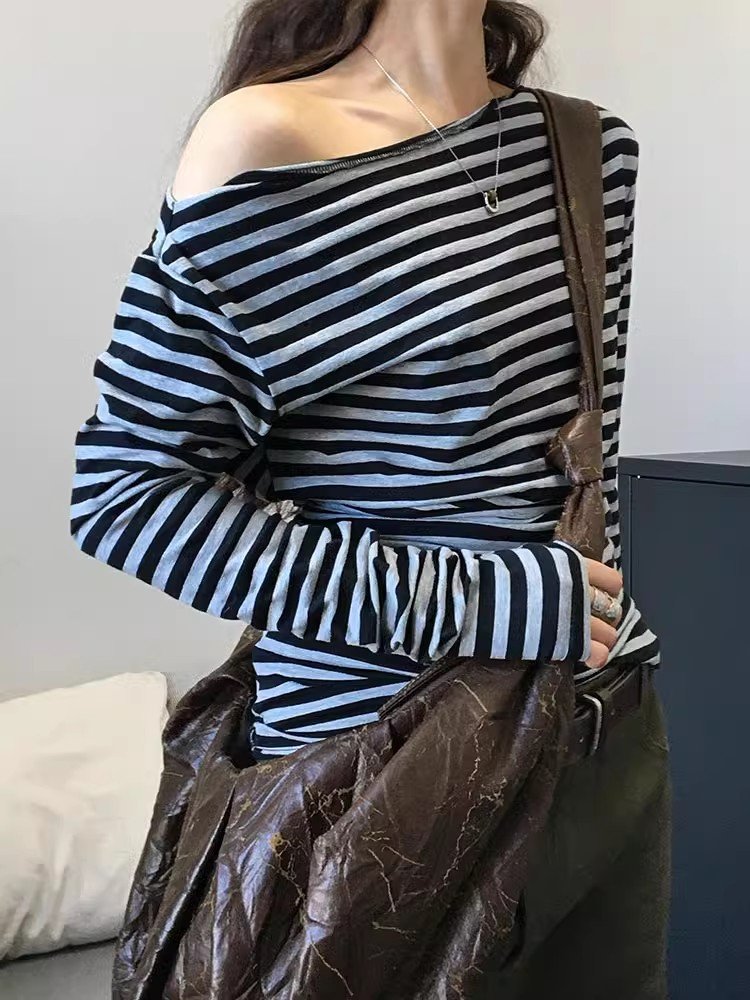 美式辣妹灰色条纹斜肩长袖t恤女内搭春秋修