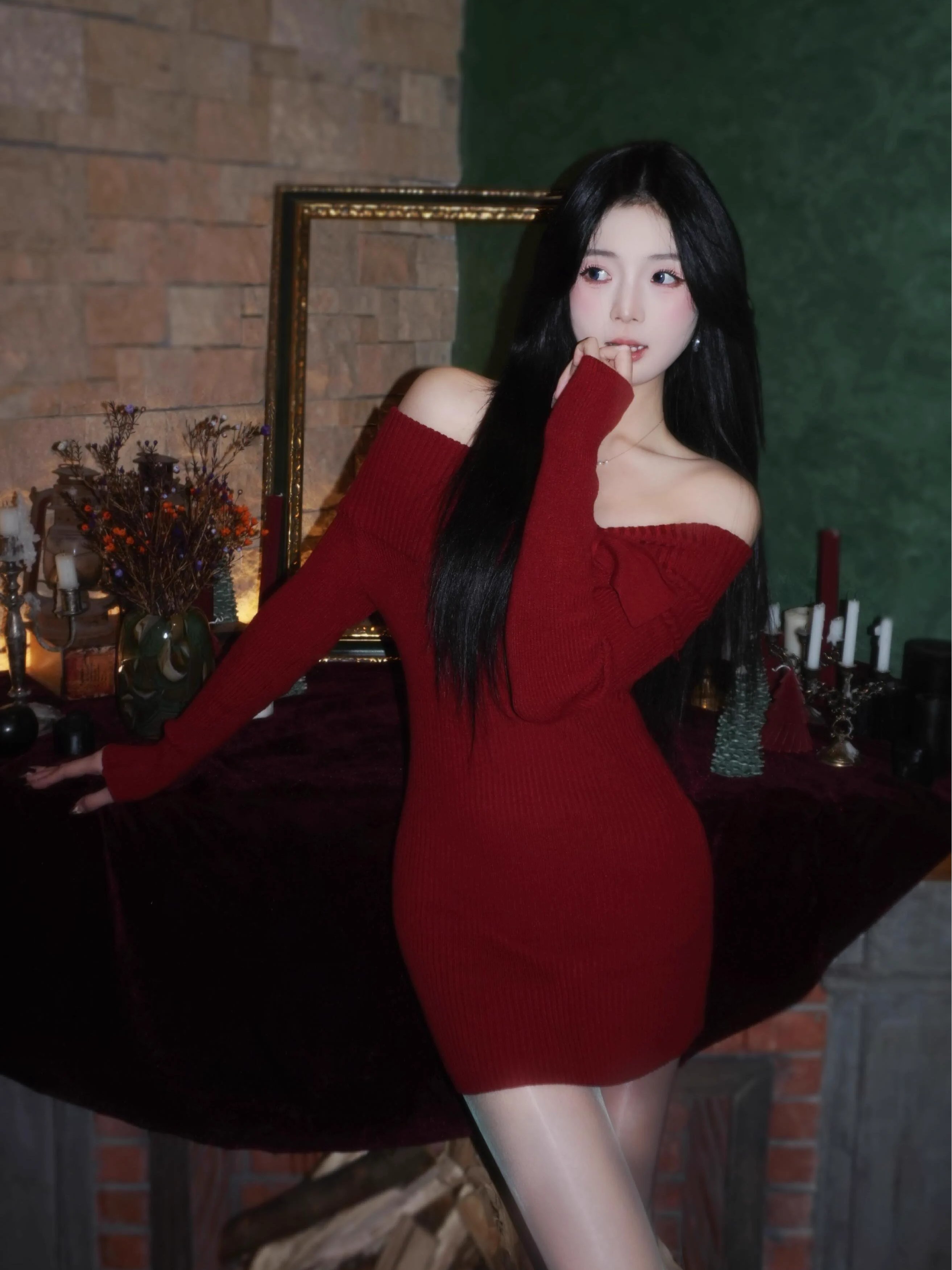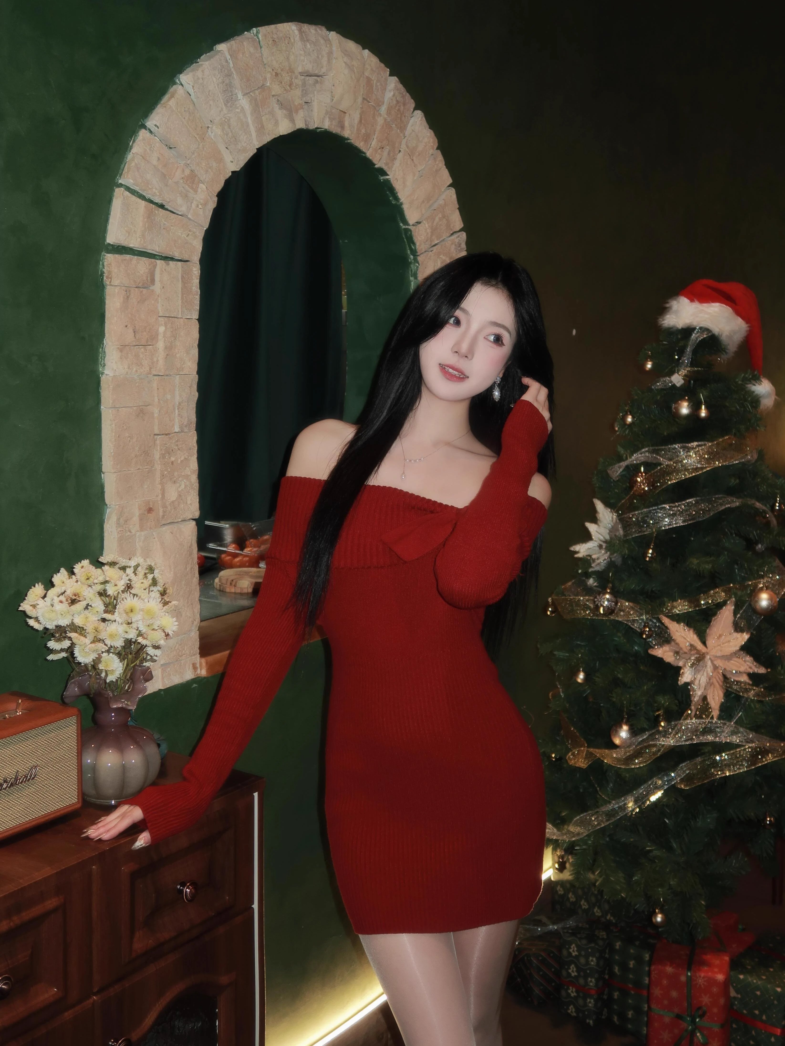 红色针织一字肩过新年战袍连衣裙