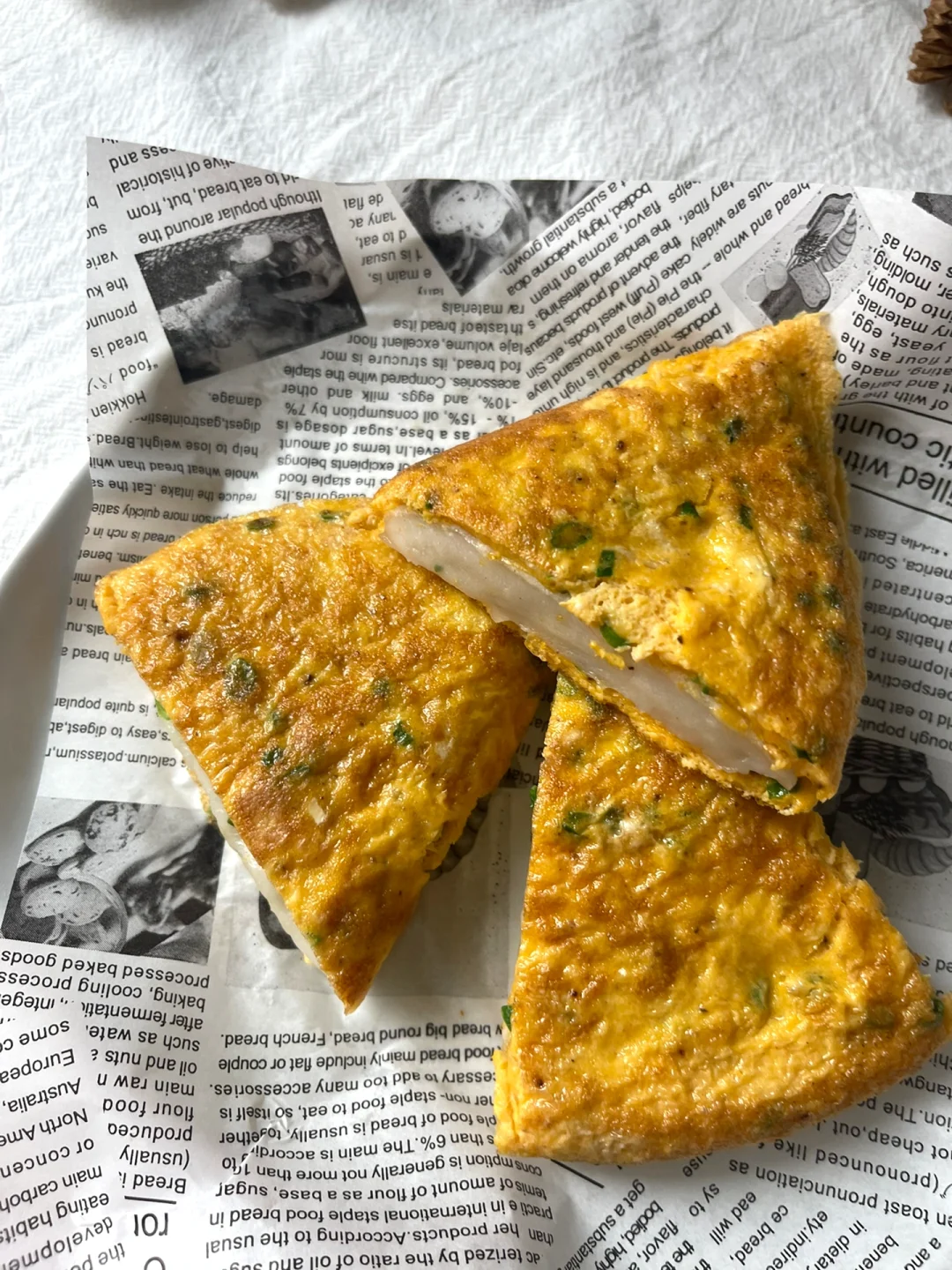 [向右R]食材:糯米粉100g、温水85g、鸡蛋3个、盐、胡椒粉、葱花