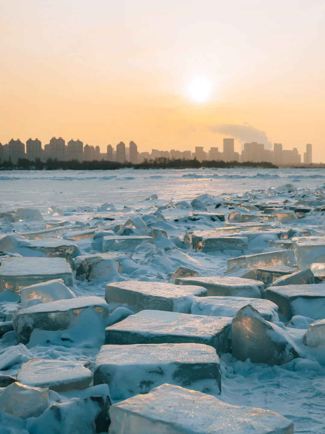 沙滩部落挨着采冰场,没运走的冰块像巨大糖块,淡蓝色的,太美了!冰雪大世界就更不用说了,所有免费项目都要排队,滑梯、摩天轮、拍照机位,人多热闹,但真的好玩!