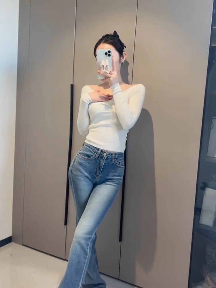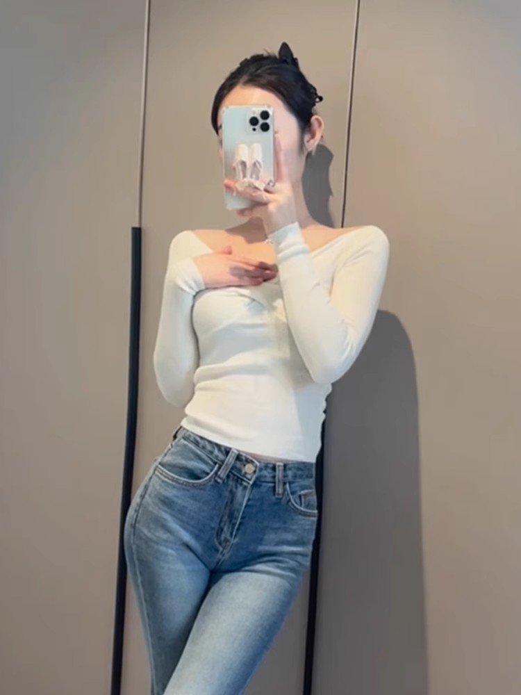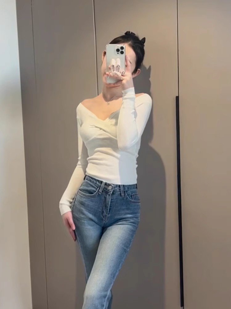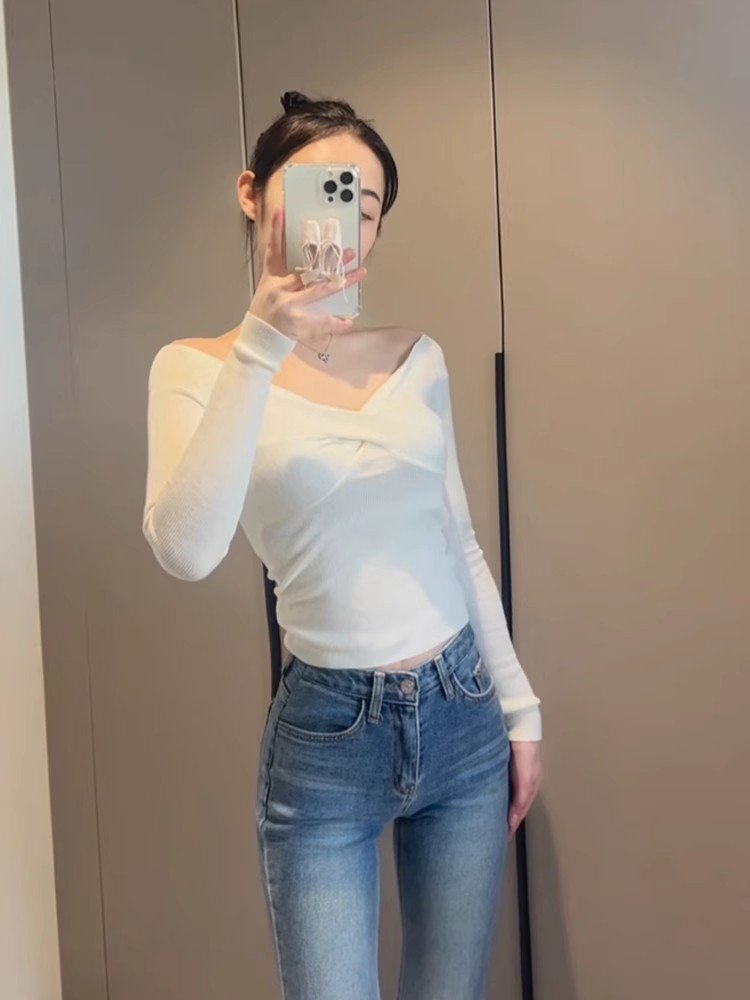 韩系白色交叉v领长袖t恤女秋冬季修身紧身