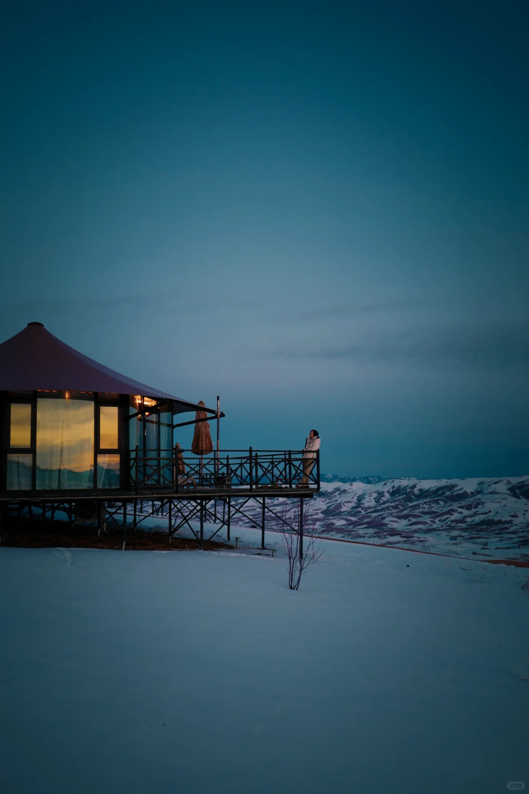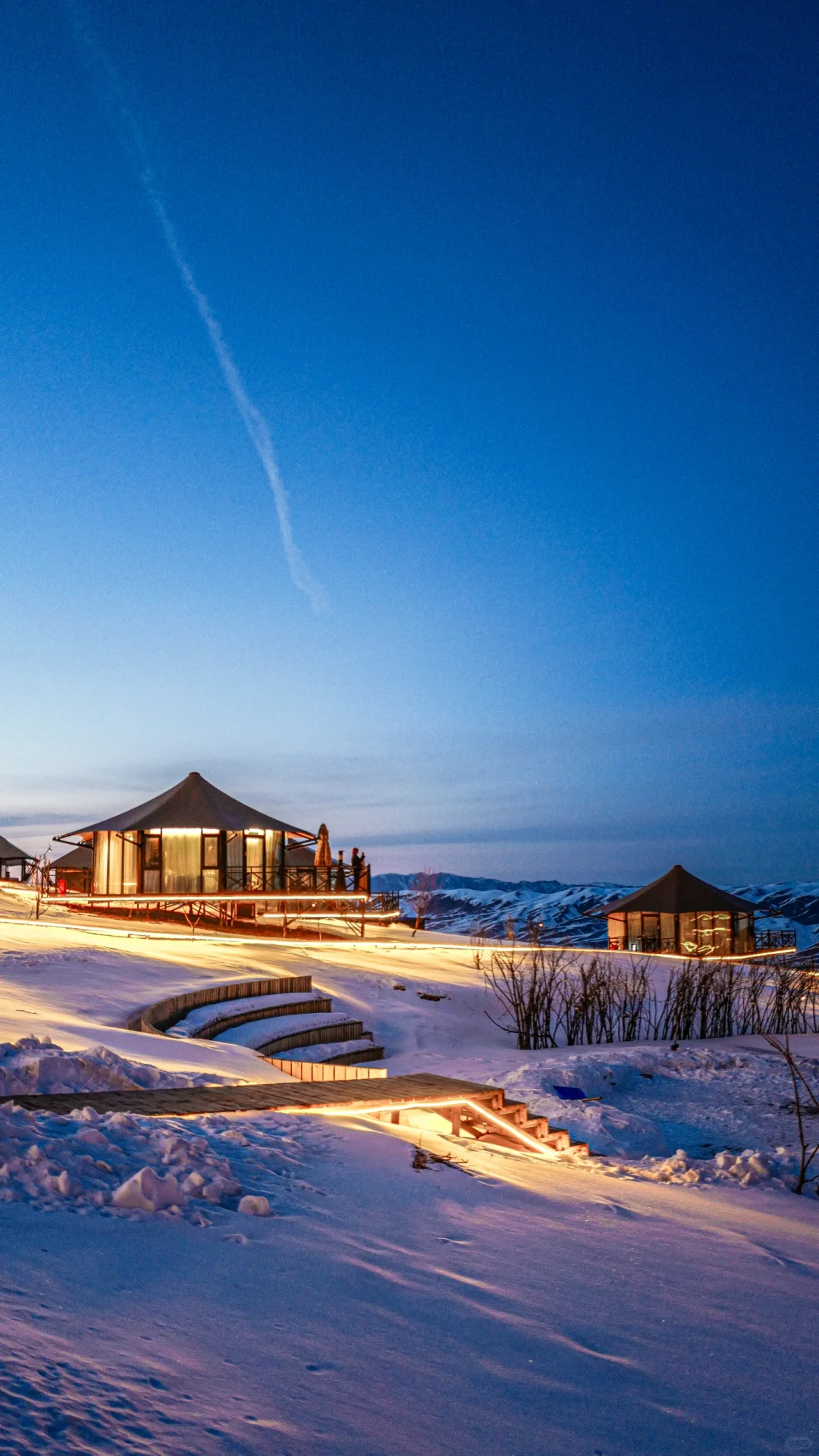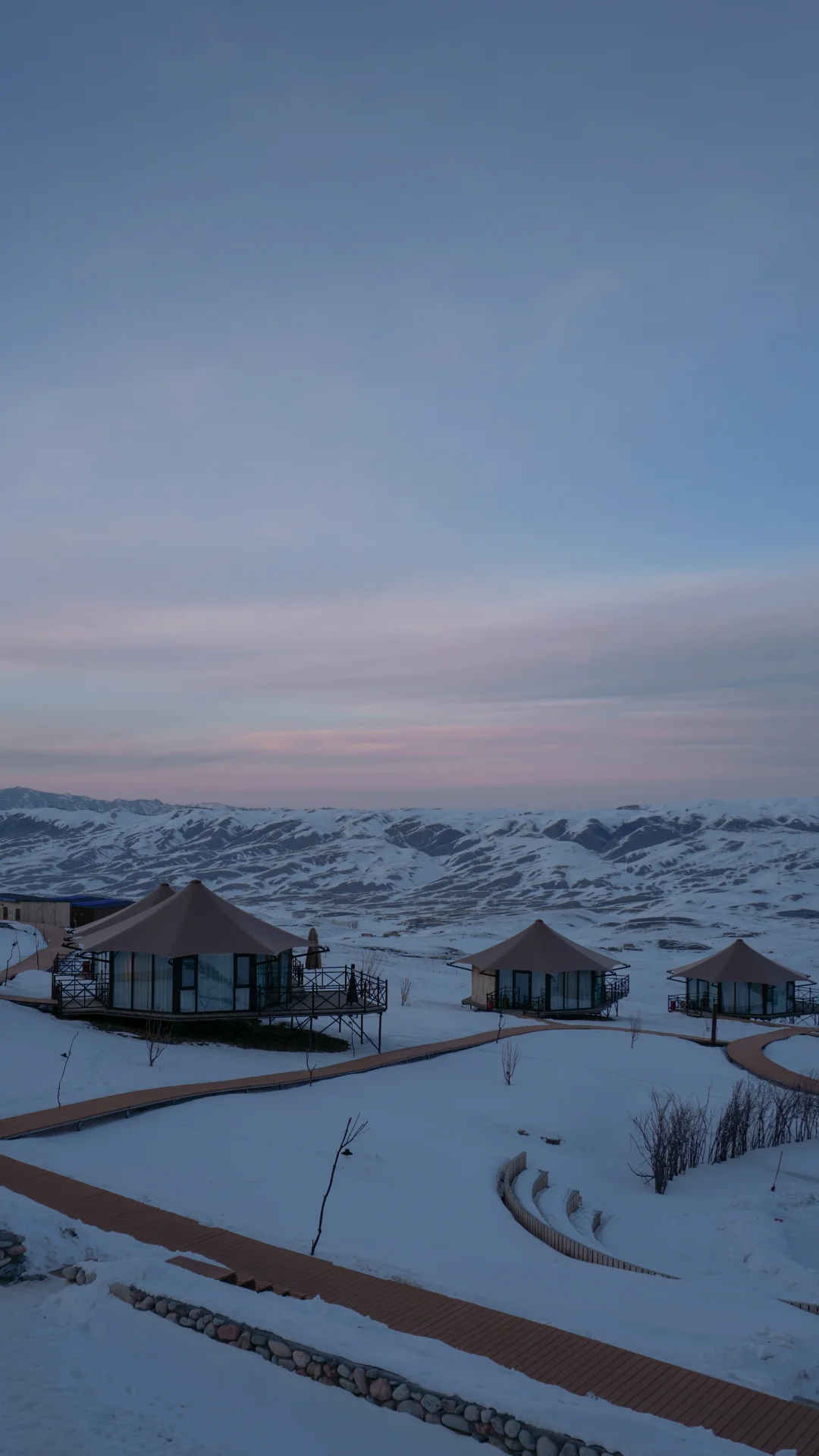 这次伊犁冰雪童话行程里的第一家野奢营地,喀拉峻花间营,今年夏天初夏伊犁时曾路过,这次特地安排了入住。没想到冬天的花间营这么美,从阳光灿烂到傍晚的蓝调天空 都是绝美风景。营地的房间设施也很好,270度的无敌雪景视野,到达前管家已经开好地暖,房间好舒服。