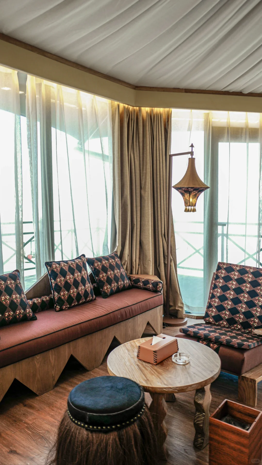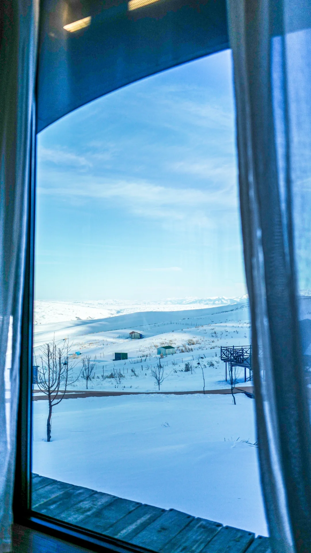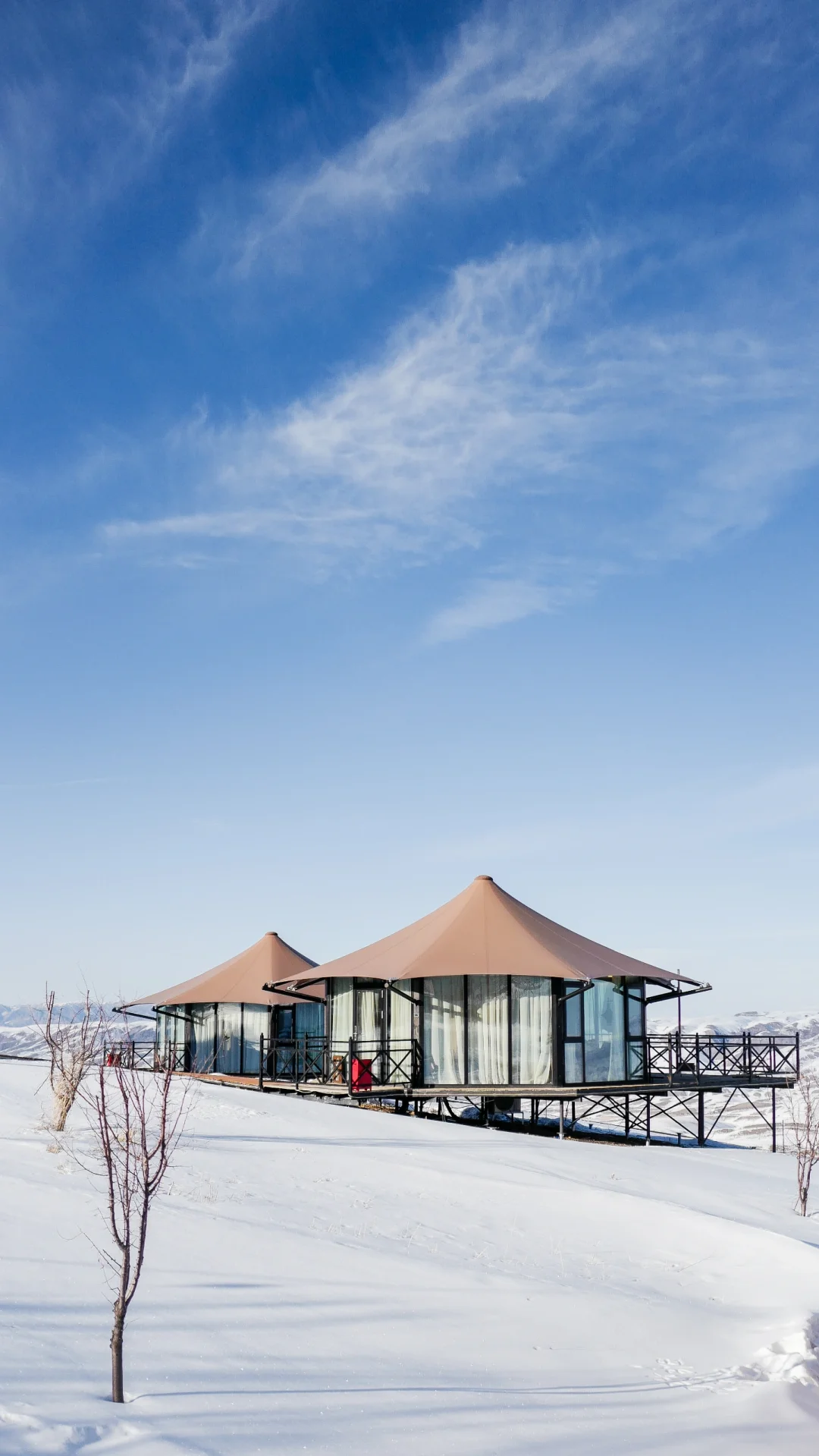 这次伊犁冰雪童话行程里的第一家野奢营地,喀拉峻花间营,今年夏天初夏伊犁时曾路过,这次特地安排了入住。没想到冬天的花间营这么美,从阳光灿烂到傍晚的蓝调天空 都是绝美风景。营地的房间设施也很好,270度的无敌雪景视野,到达前管家已经开好地暖,房间好舒服。