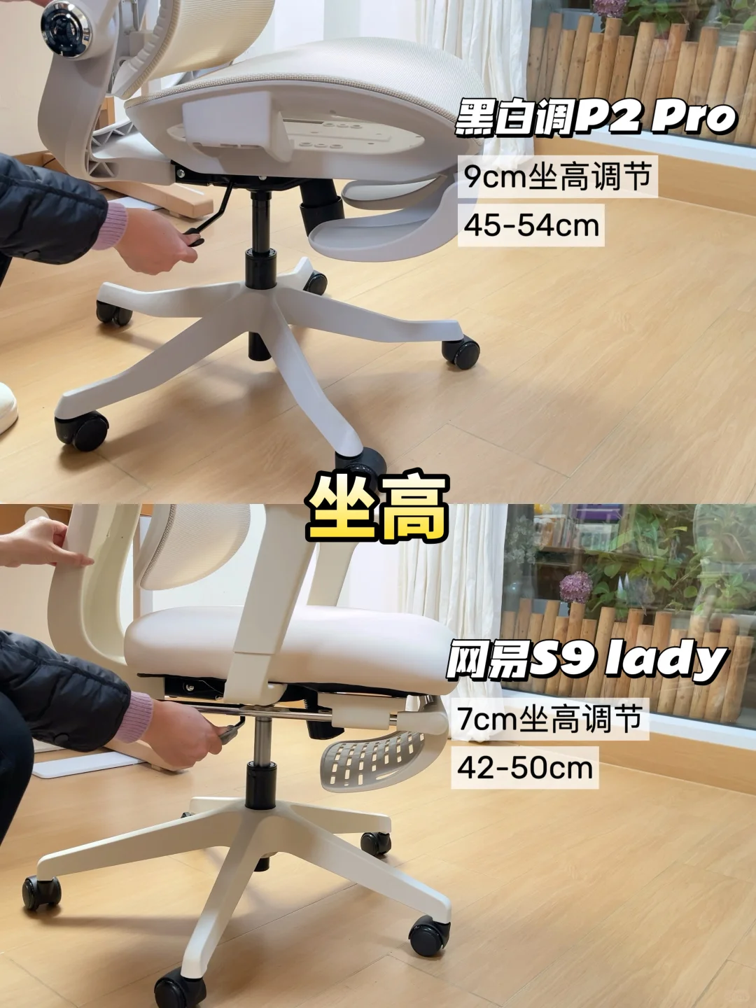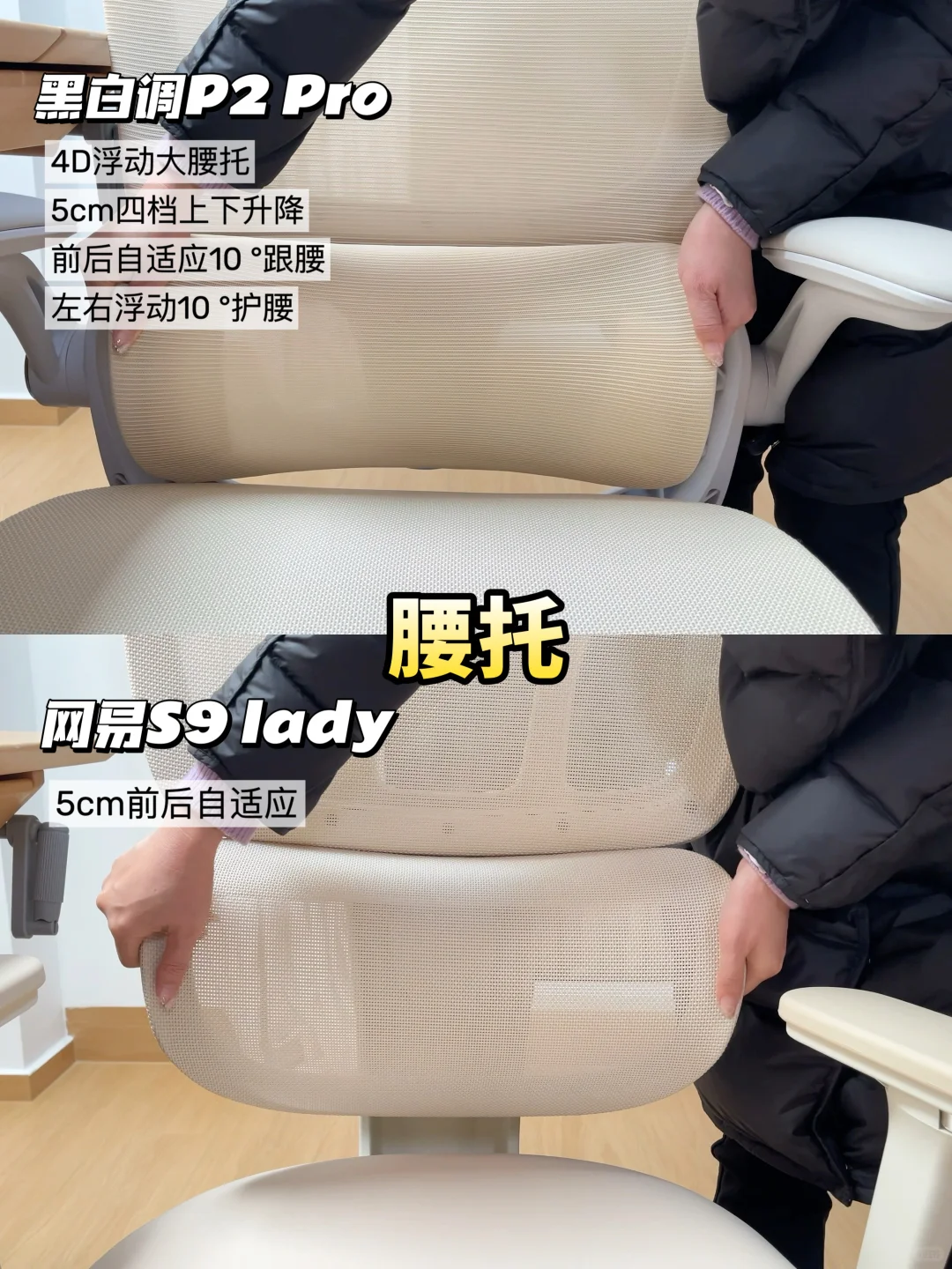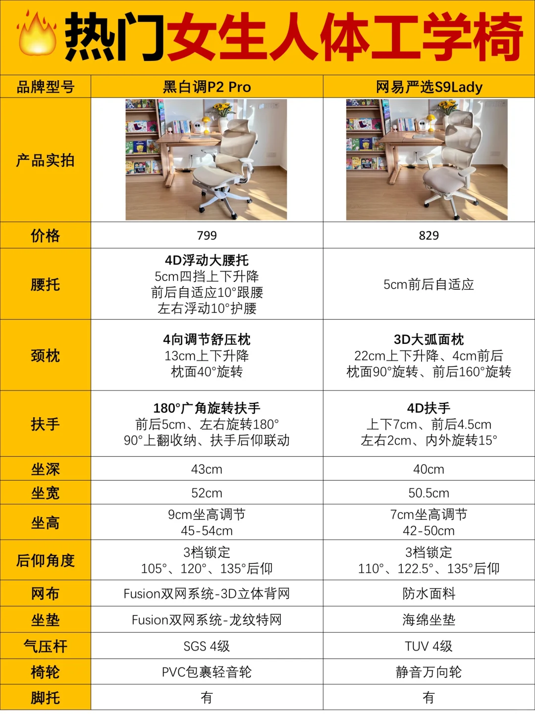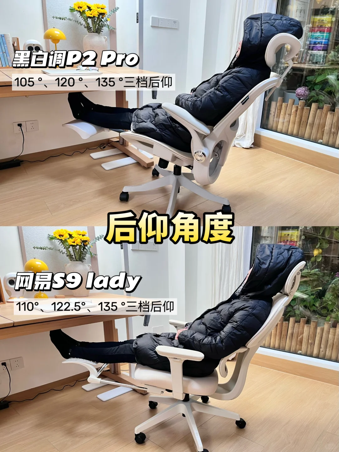 🧐我选了两款市面上热门的女性人体工学椅:黑白调P2 Pro和网易严选S9 Lady进行实测,具体情况可以看图,👭姐妹们可以按需选择哦~