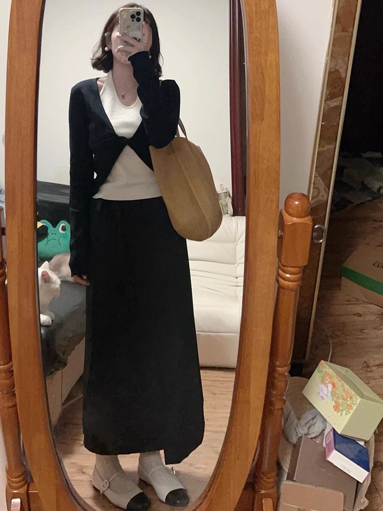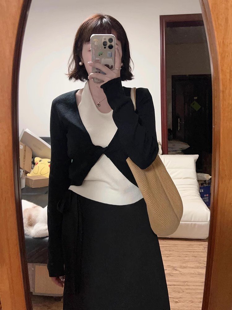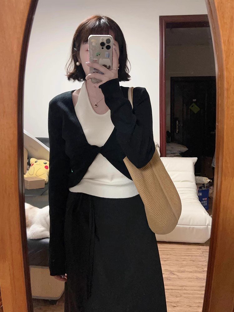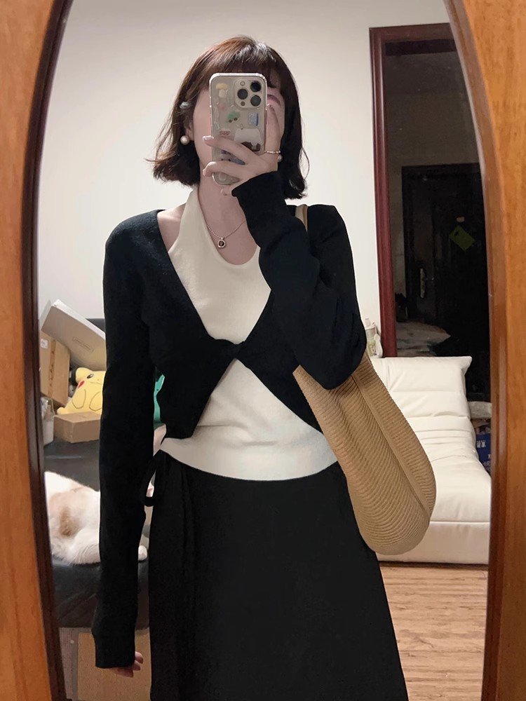 法式别致黑色挂脖假两件长袖针织t恤打底衫