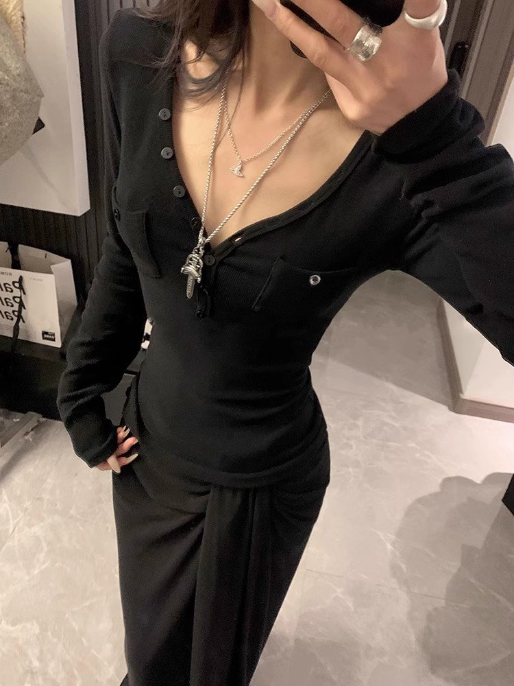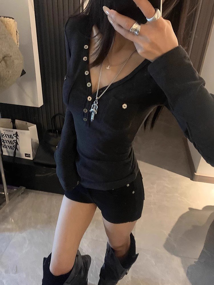 美式辣妹白色v领长袖t恤打底衫女内搭春秋