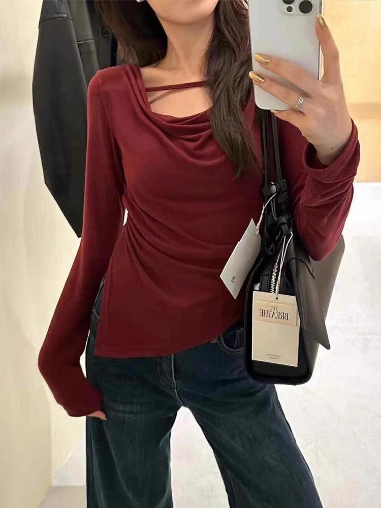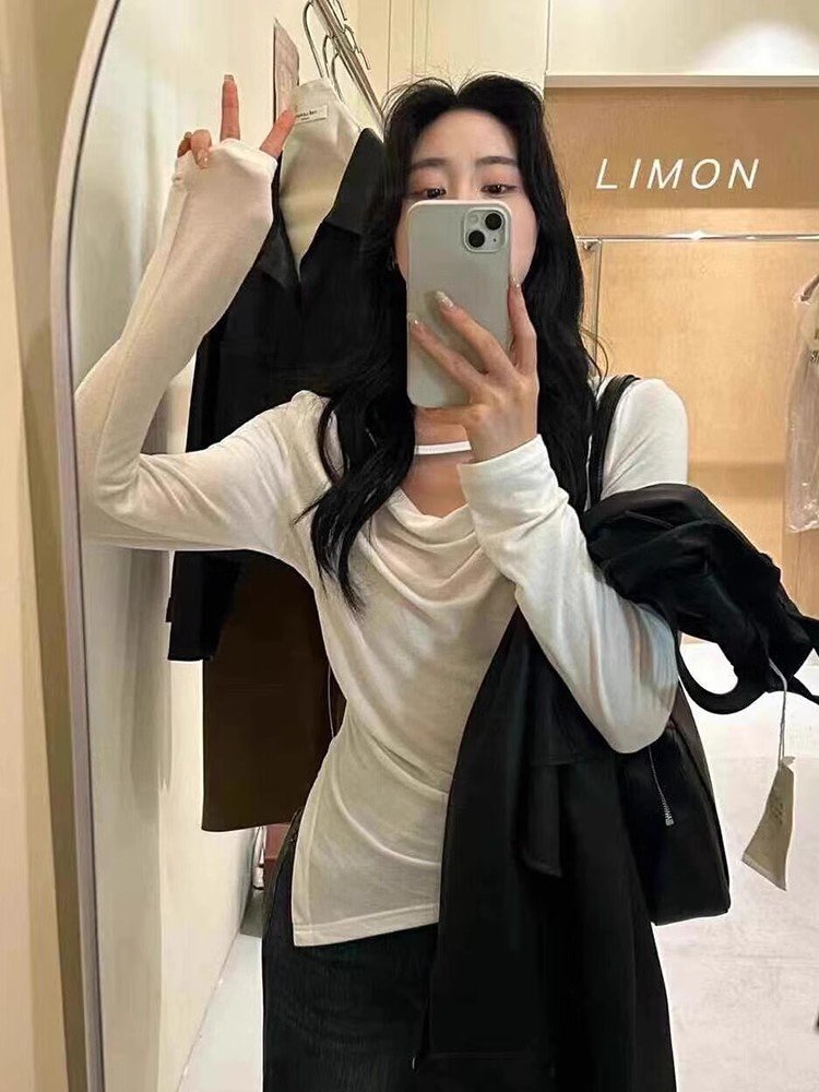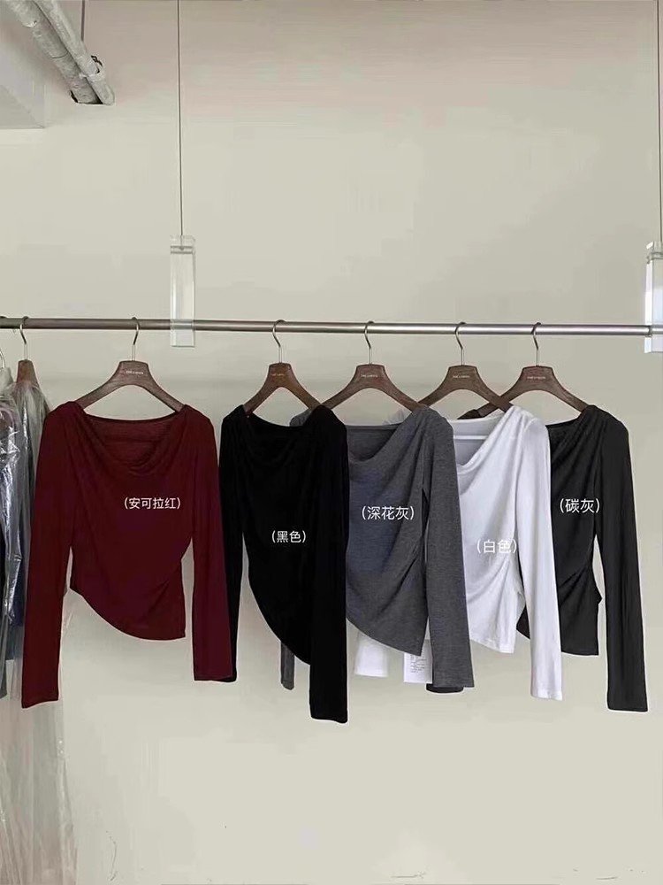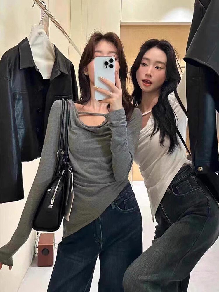 韩系灰色镂空荡领长袖正肩t恤女春秋不规则
