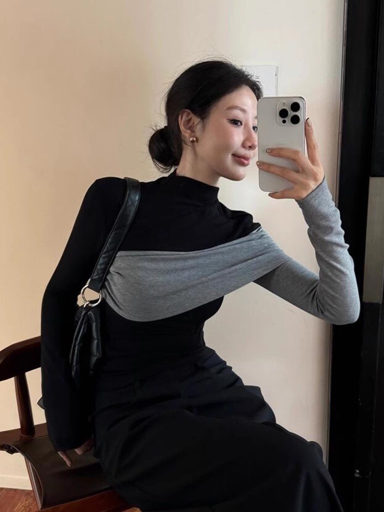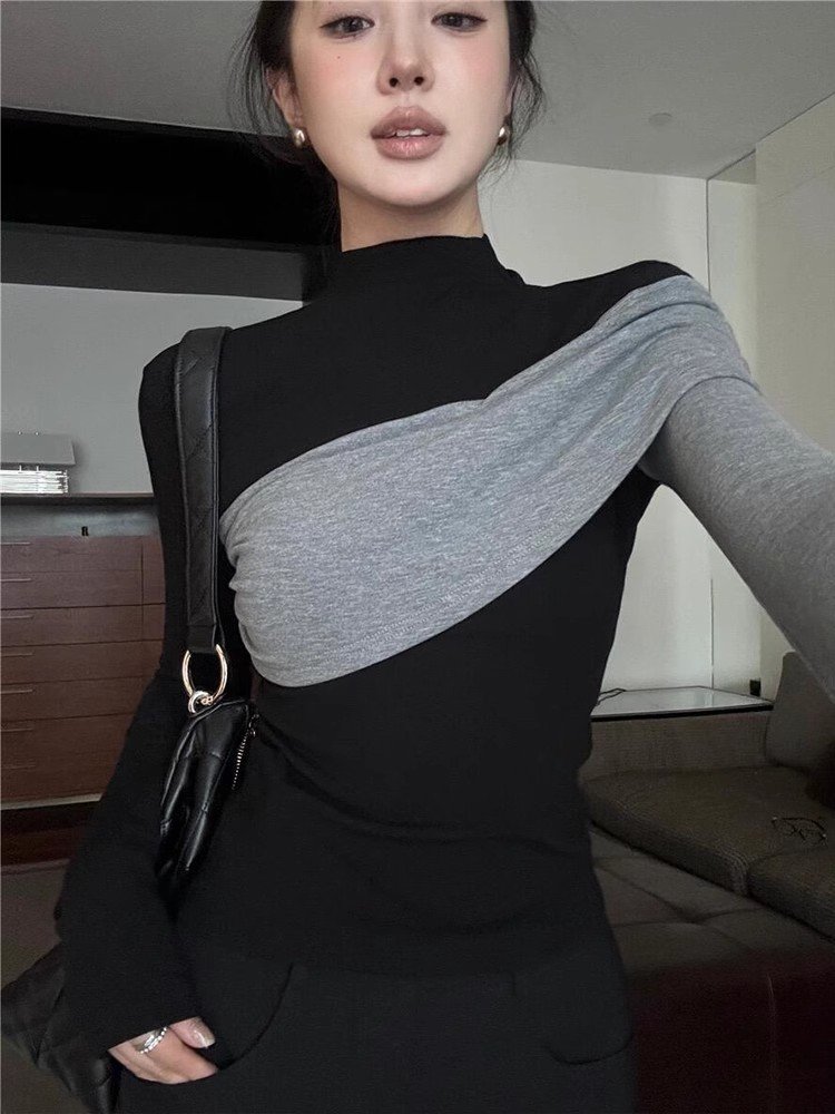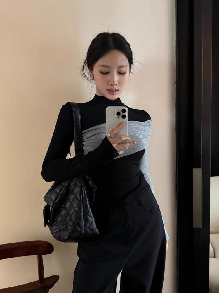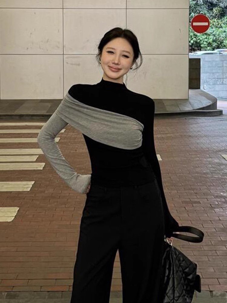 法式黑色半高领正肩长袖针织t恤女春秋小众