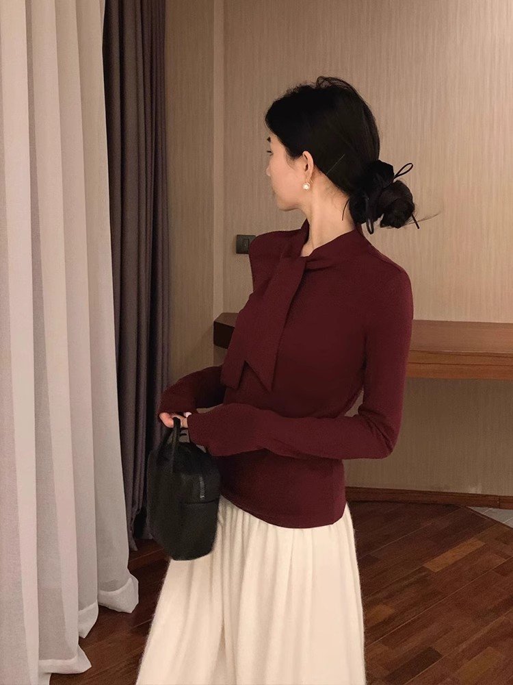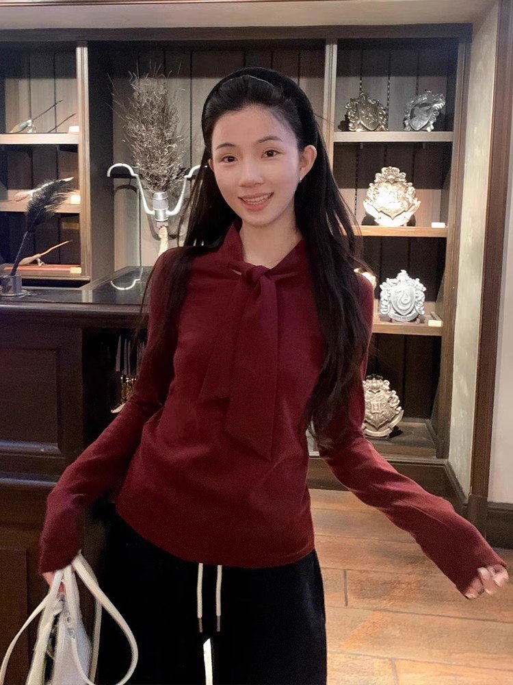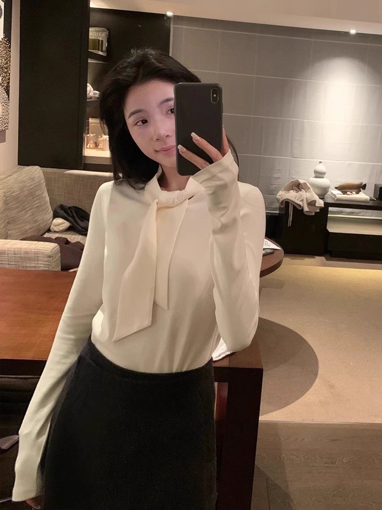 韩系白色短款系带长袖正肩t恤女春秋修身显
