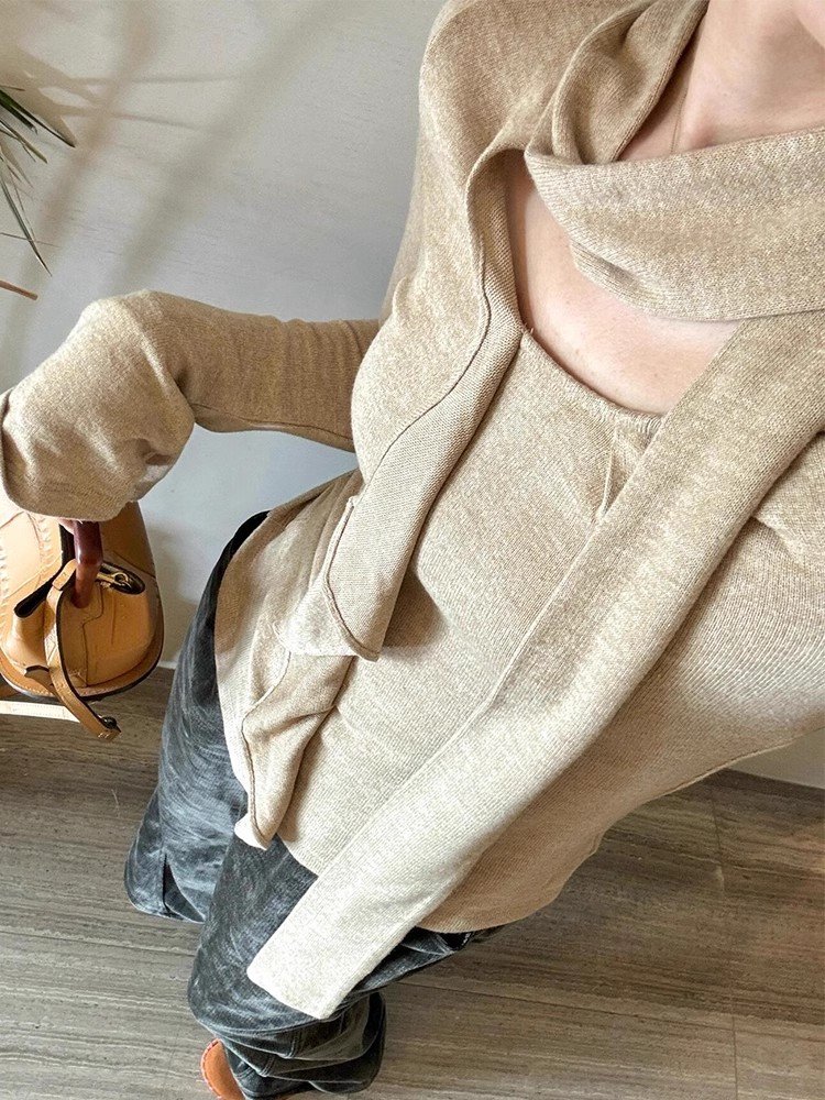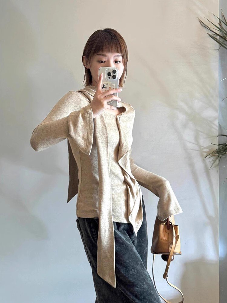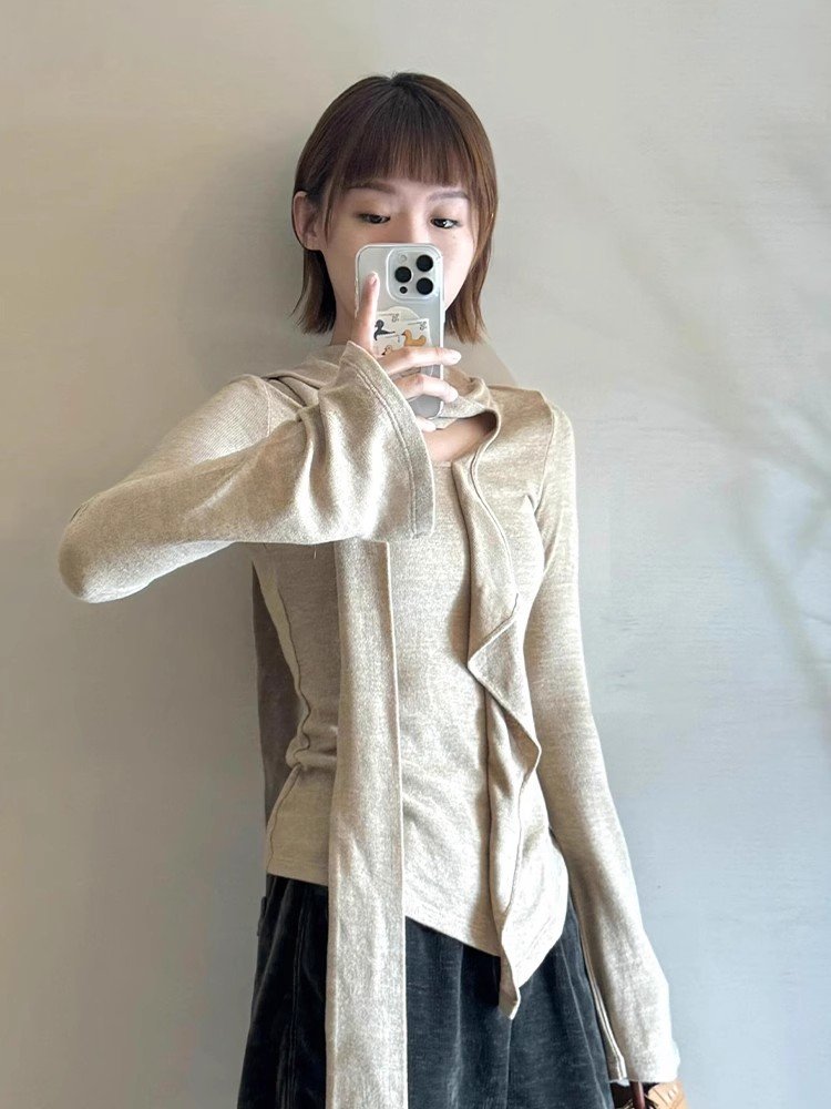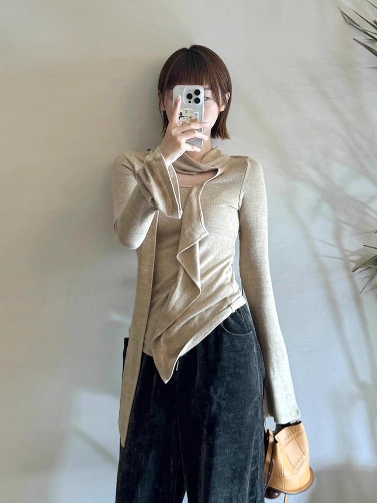 燕麦色短款挂脖低领长袖t恤女春秋小众设计