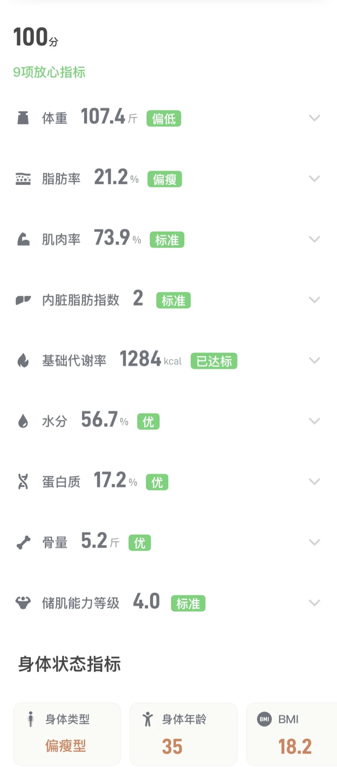 体重107.4,体脂21.2%,身高172,昨天108斤,是我的历史最高体重了。