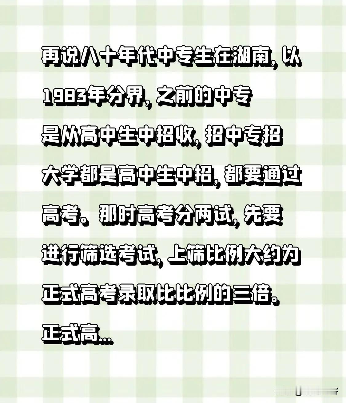 再说八十年代中专生 在湖南,以1983年分界,之前的中专是从高中生中招收,招中专招大学都是高中生中招,都要通过高考。那时高考分两试,先要进行筛选考试,上筛比例大约为正式高考录取比比例的三倍。正式高考录取比例每一年是不一样的,低的小于2%,高的小于5%,从高分录到低分,和现在方法差不多。先本科,再专科,最后是中专。那时高考总录取比例和现在九八五不相上下。所以,那时考的即使只是中专,但智力也是相当不错的。那时还有几年,是采取高考后考生估分填志愿,由于各人估分松紧不一,所以也有可能有人分数比较高,上了本科录取线,最后也只录取一个中专。这种中专也有人称为大中专。由于那时人才缺乏,所以,这批人一般分基层,但都是干现在九八五甚至研究生才能干的事情。 初中毕业通过中考考上中专称为小中专,录取率也只百分之几,一个班只考0——2个。一般都是班上第一名,顶多是第二名,否则考不上。一般花费很少。所以,常常是农村孩子去考。但那时,城镇人口占比较低,所以,考这样小中专在农村是大受欢迎的。只是成绩仅一般的好也是考不上的。这种中专生分下来也大受欢迎,能干重本生(一本)的工作。 八十年代的中专生所学习知识比现在的本科生学得少,学得浅,但他们能力比较强劲!学过的东西能干好,没有学过的东西通过自学也能干好。其次,他们工作兢兢业业,刻苦钻研,也是工作出色的重要原因。 从上面我们也可以看出,一个人最重要的是能力,并不是知识;能力强的可以自学知识,创造性地开展工作;能力弱的,即使掌握了一定的知识,也难免生吞活剥,捉襟见肘。这也是现在高分高文凭低能的重要原因 以上观点仅供参考。