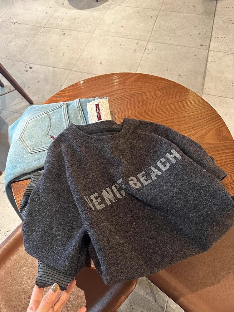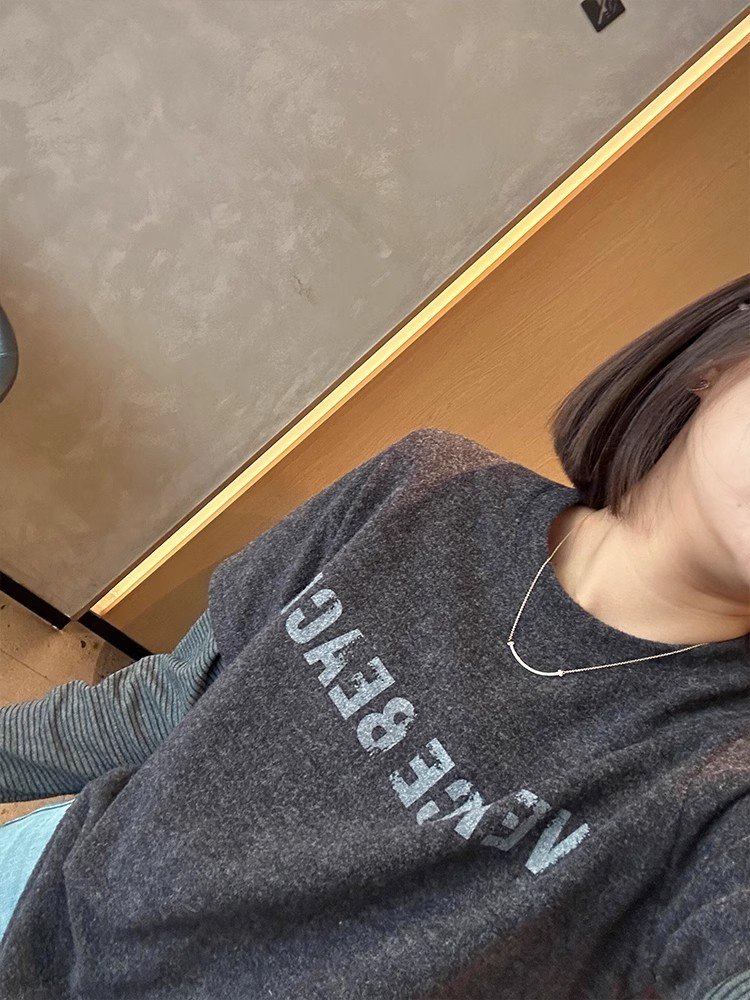 美式复古灰色印花假两件长袖t恤女春秋甜辣