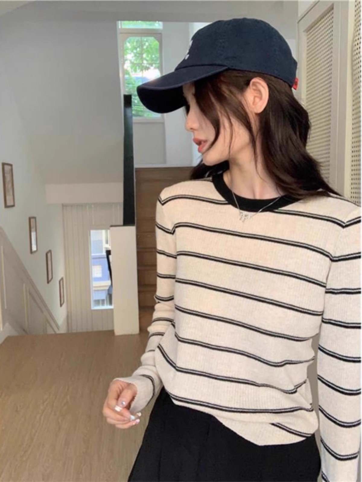 条纹小衫独特别致漂亮上衣长袖t恤针织打底