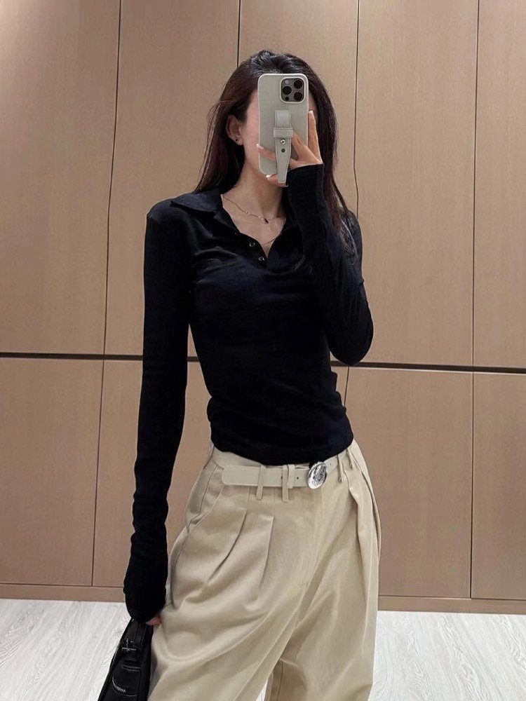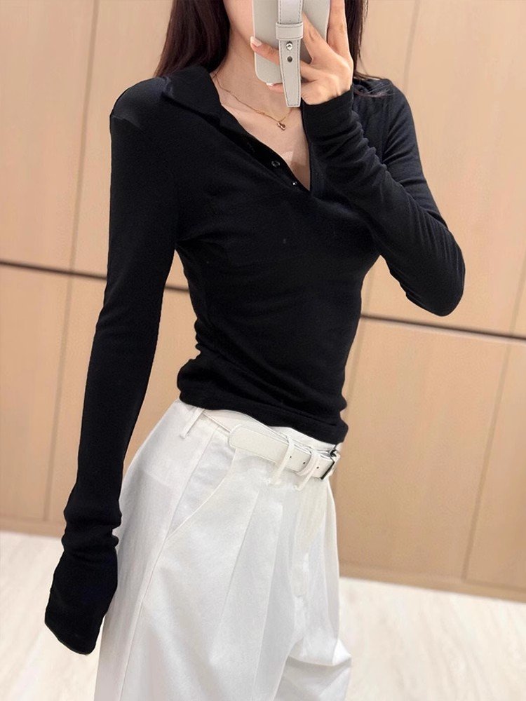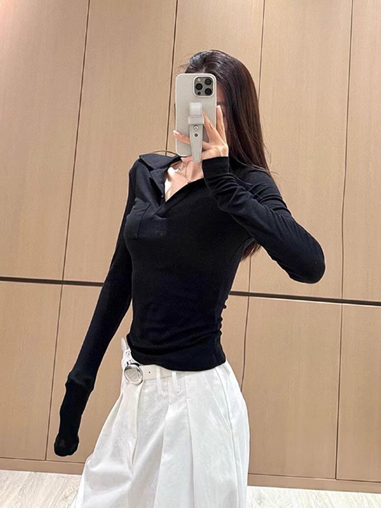 正肩短款黑色polo领长袖t恤女内搭春秋
