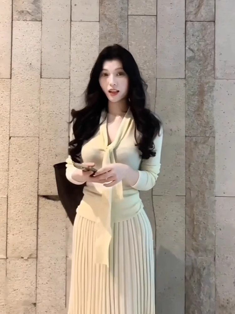 早春飘带v领长袖针织衫t恤女春秋季小个子