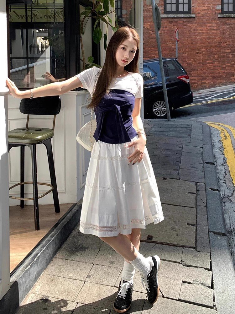 白色假两件正肩短袖t恤女夏季薄款小个子设