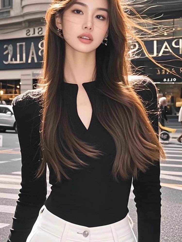 小个子黑色v领打底衫上衣女春秋穿搭高级小