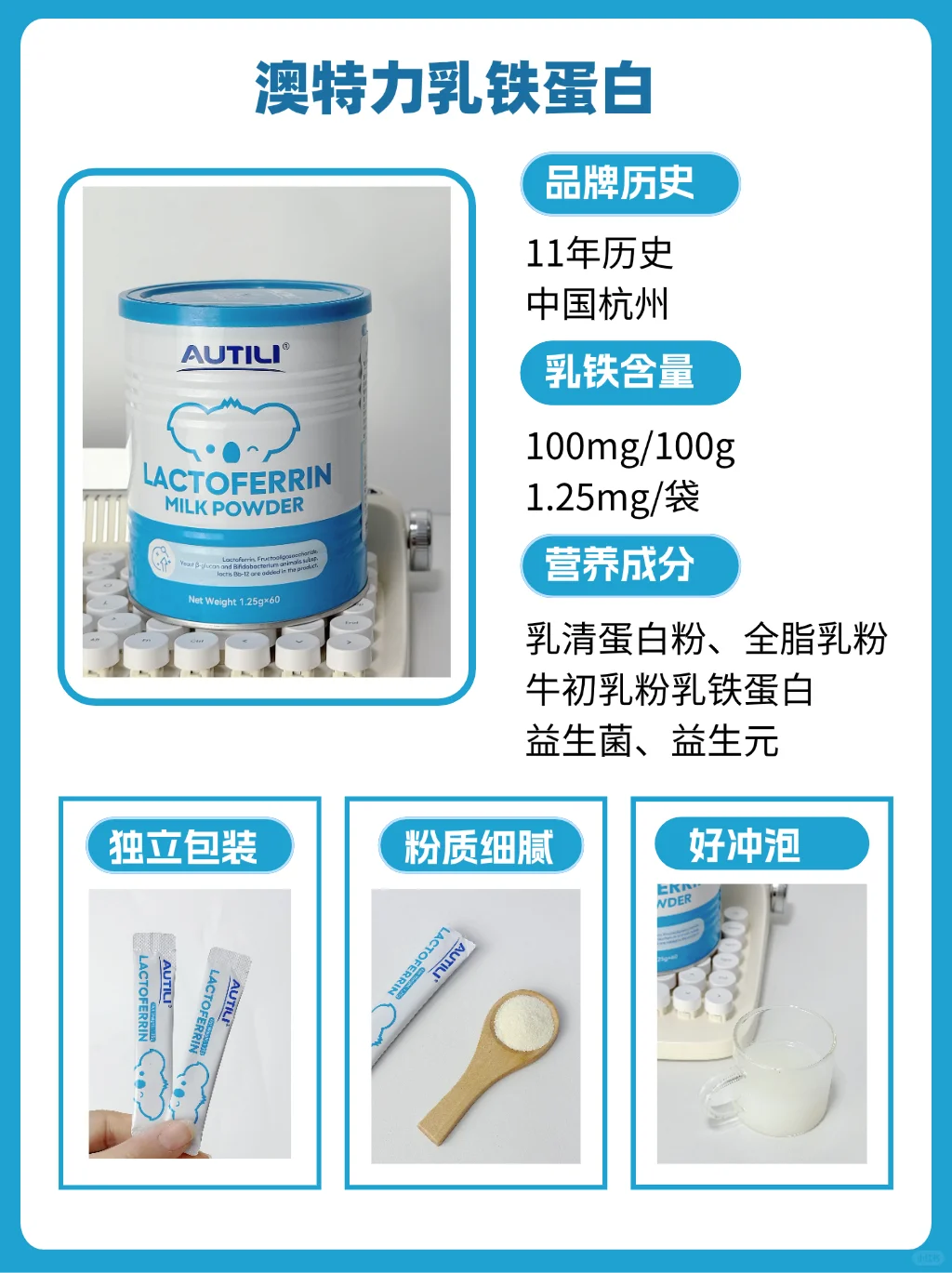 成分:浓缩乳清蛋白粉、乳铁蛋白、脱脂乳粉、益生菌、HMO
