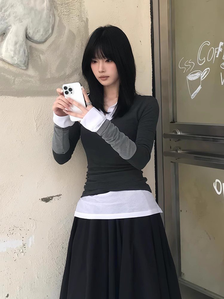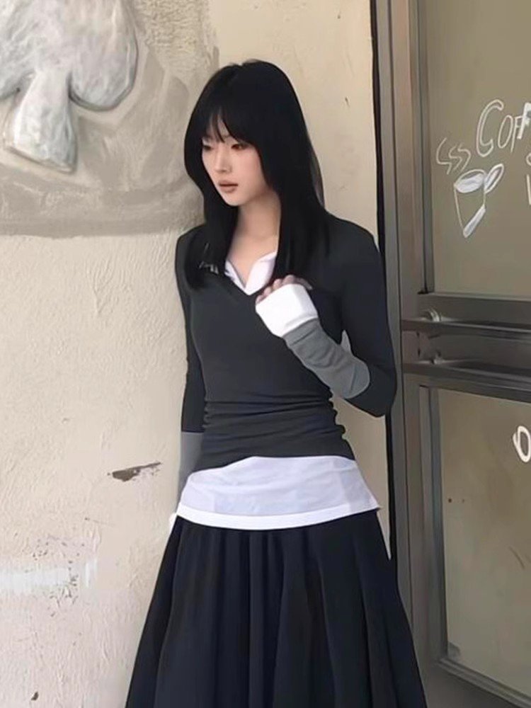 灰色短款假两件v领长袖正肩t恤女春秋季修