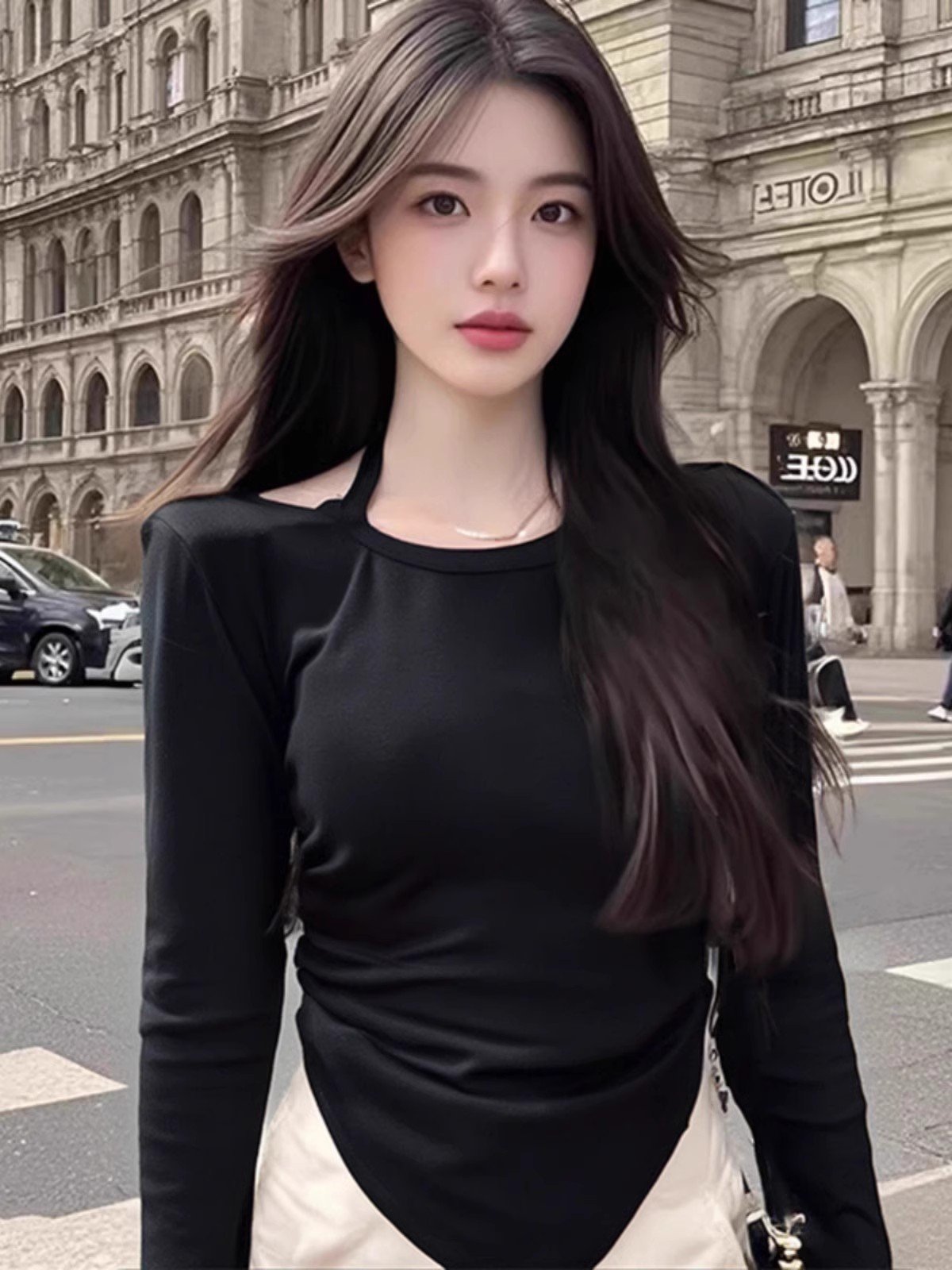 韩系灰色挂脖大领口露肩长袖t恤女春秋不规