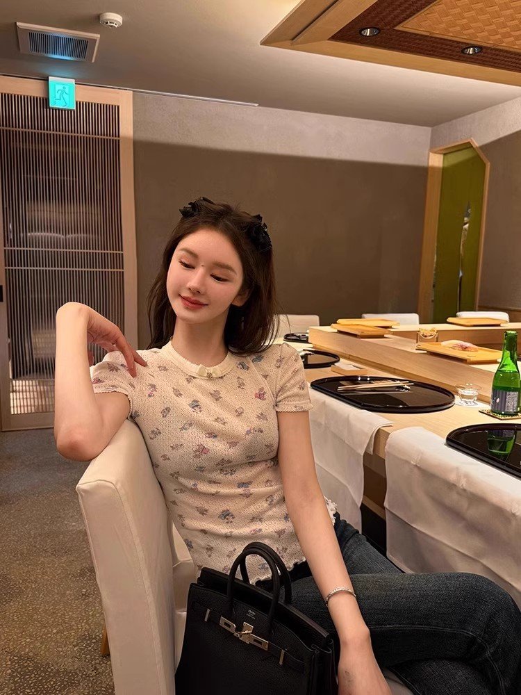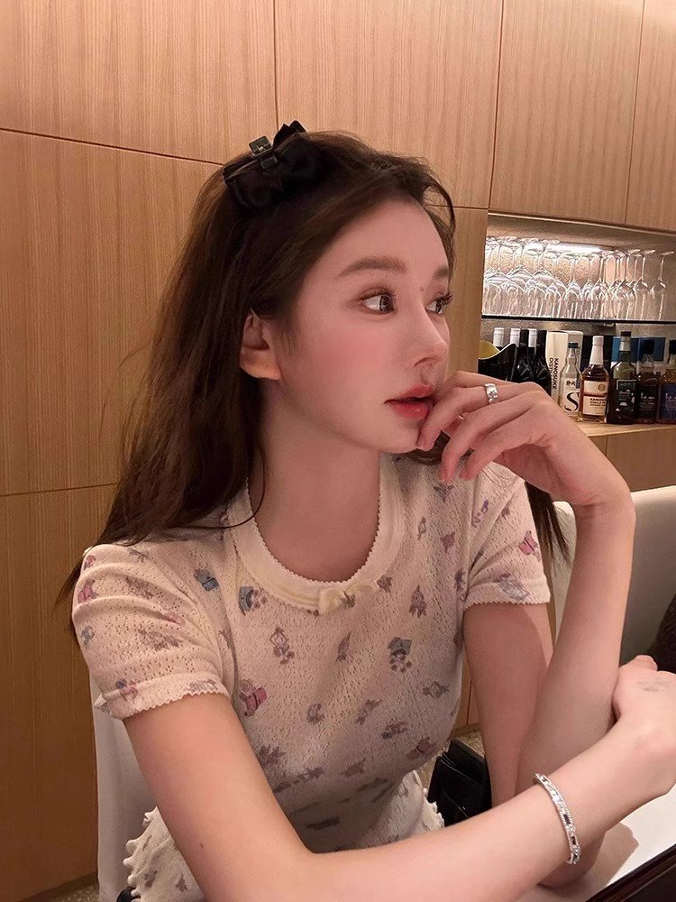 韩系白色碎花圆领正肩短袖t恤女春秋木耳边