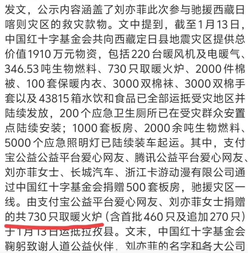 怪不得明星现在捐款,都找韩红。刘亦菲之前已捐50万,文中只字不提。让网友误解,刘亦菲只捐730只手炉。