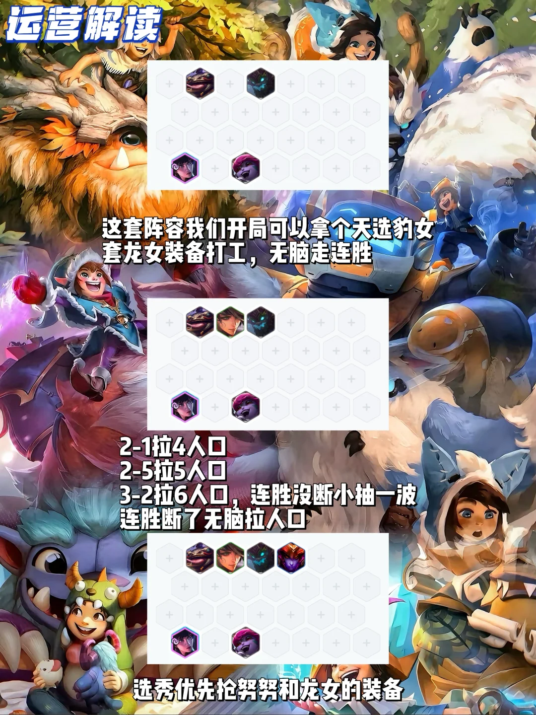 说起福星赛季的不死之王,那一定有努努的一席之地。一口破万的真实伤害,还带回血简直就是毒瘤中的毒瘤。那么今天阿冷就给大家带来这套八斗努努,姐妹们抓紧学起来,拿去爽吃! 🧧直接来画小重点🧧 大家注意一定要保证努努是神装,同时后期有新春使者的情况下,可以下一个低费斗士去补优质5费卡。那么大家拿去猛猛爽吃的同时,也别忘了给阿冷点个小关注!这对我真的很重要!需要代码的小伙伴私信我一下!