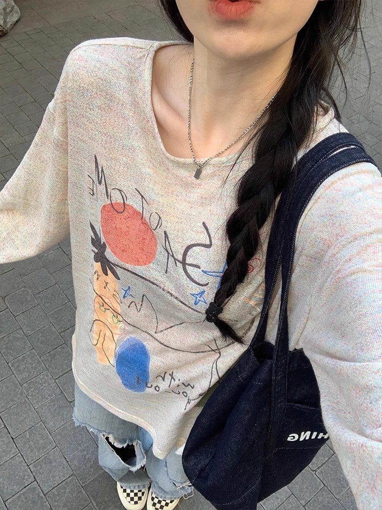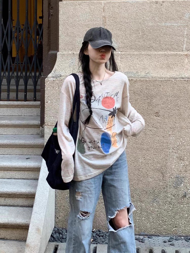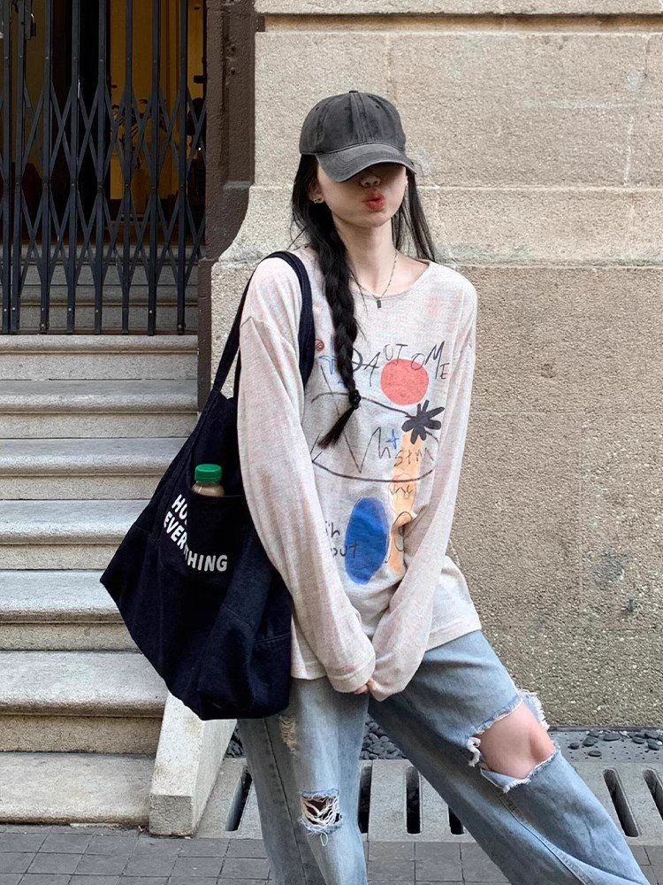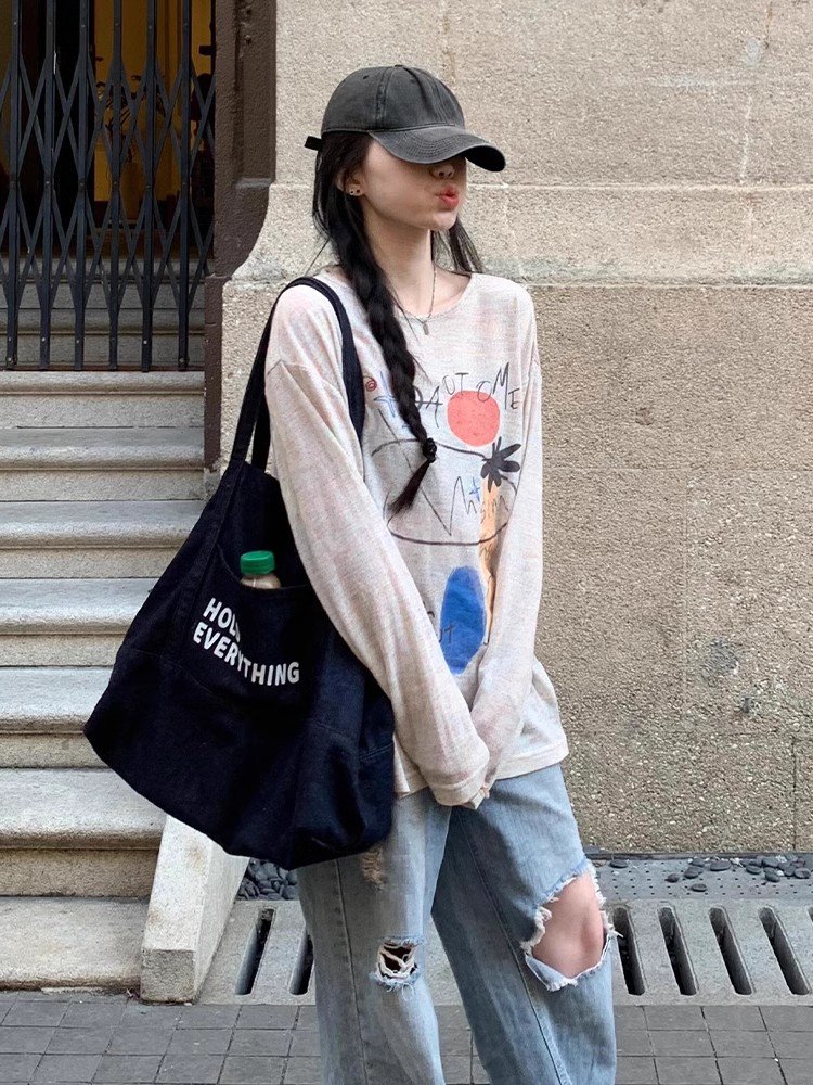 韩系灰色圆领长袖正肩t恤女春秋季宽松打底