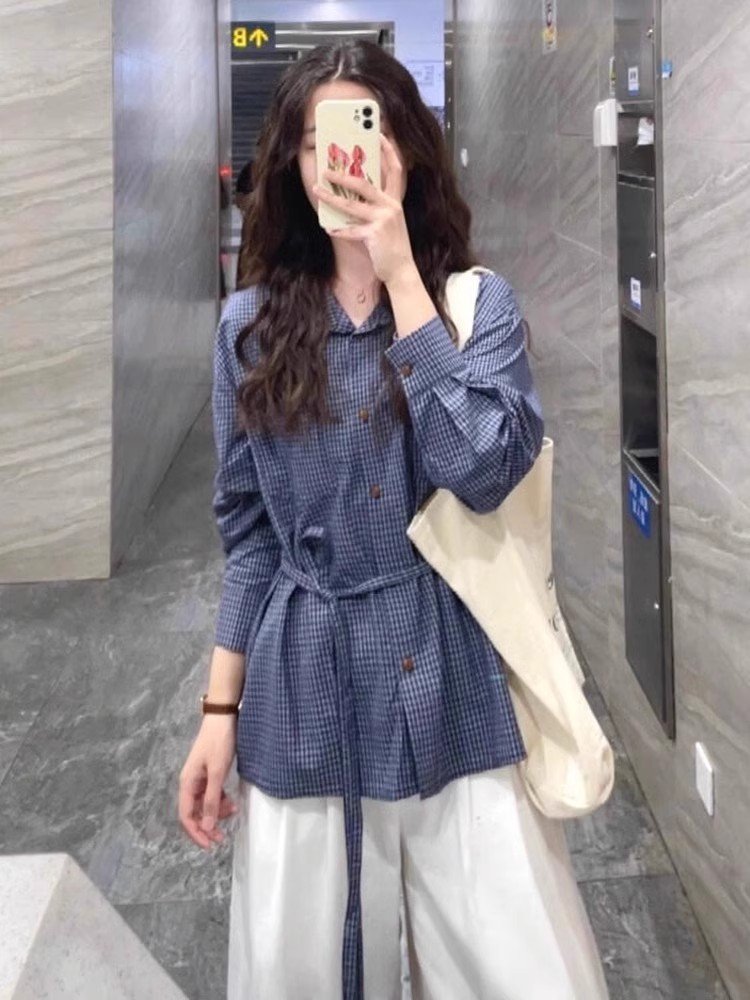 早春蓝色条纹翻领衬衫上衣小众设计感宽松外