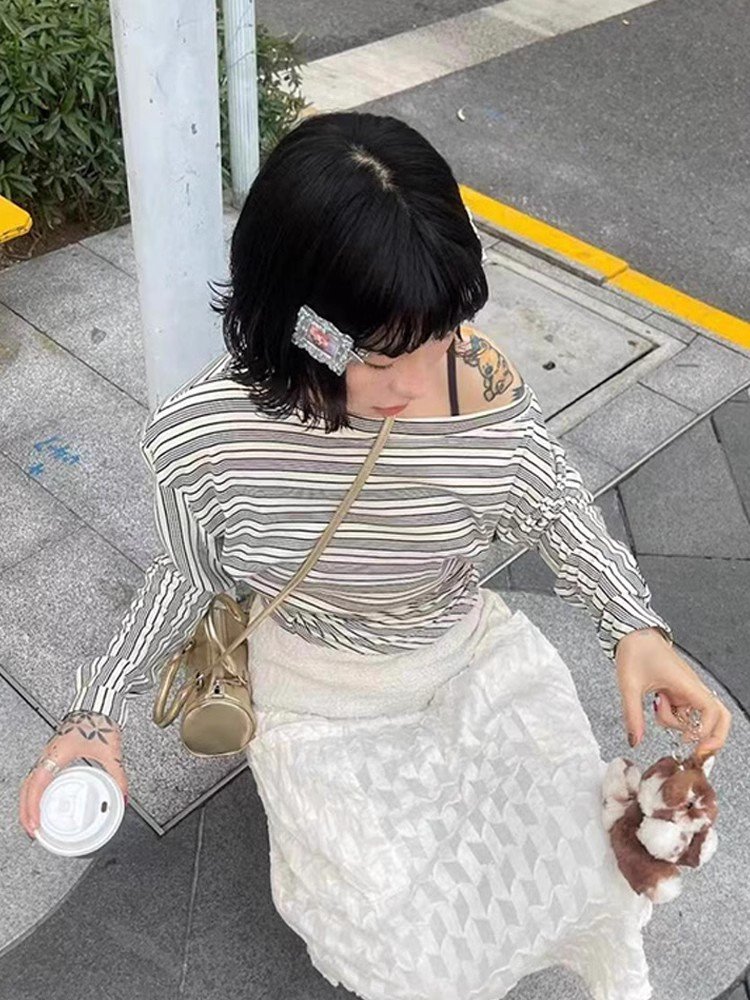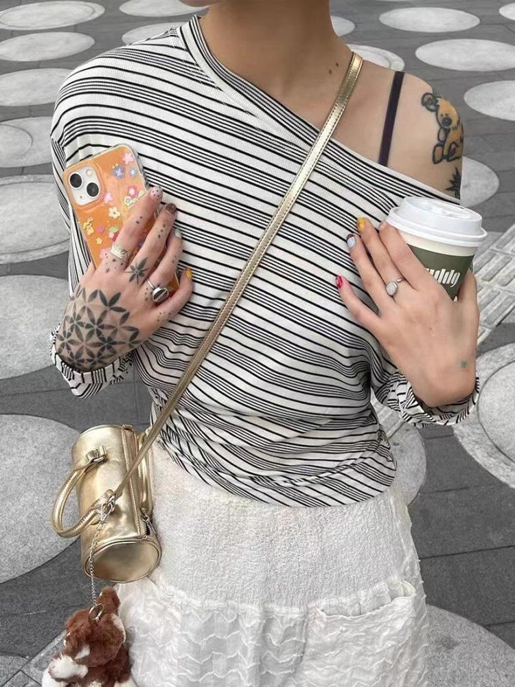 韩系白色条纹斜领露肩长袖t恤女春秋季小众