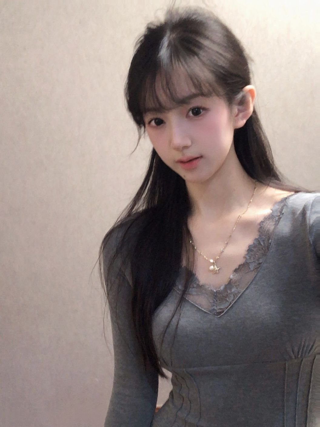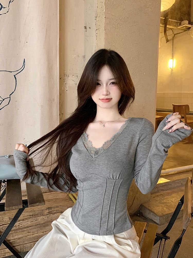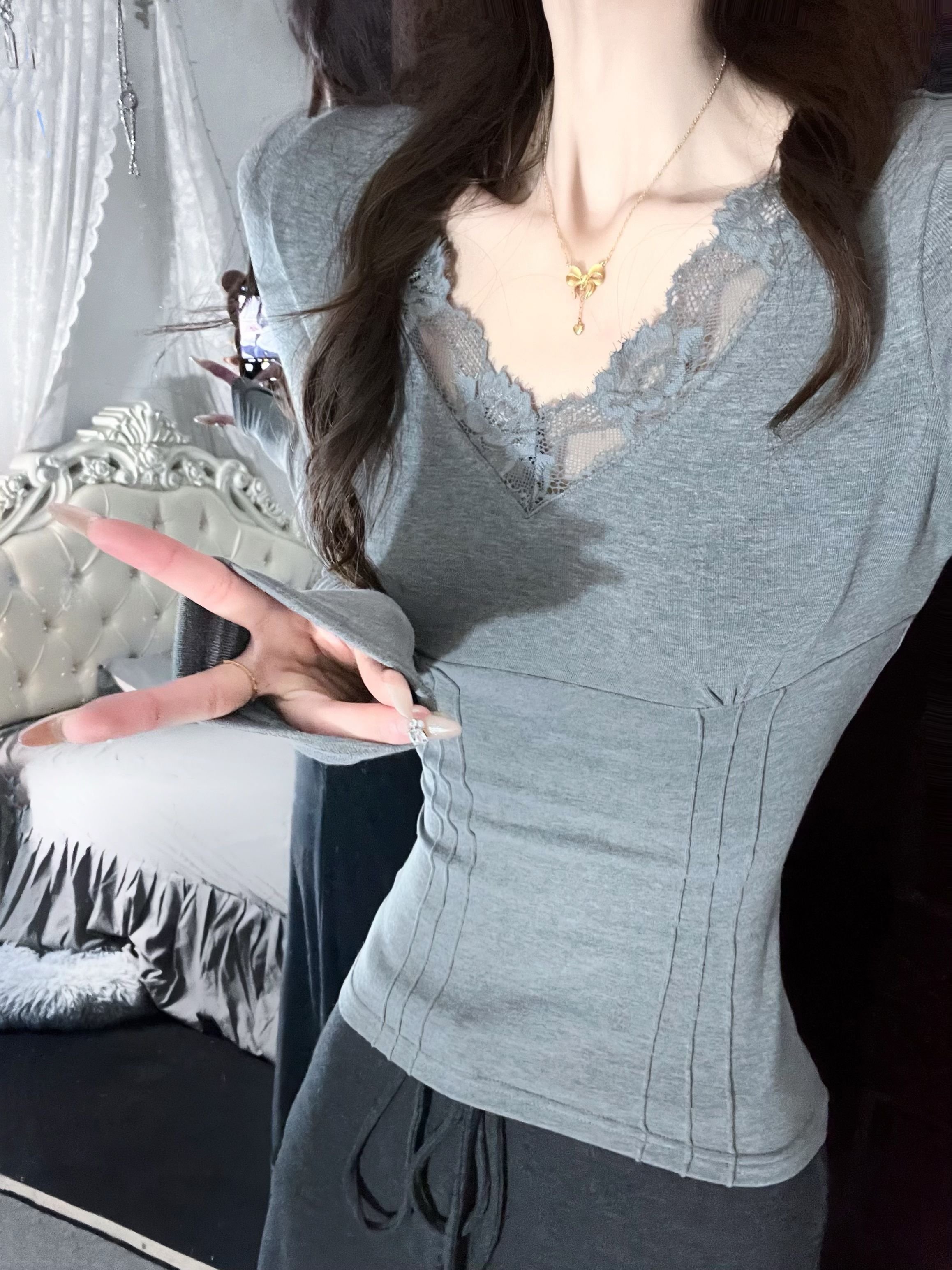 法式后背蕾丝拼接灰色v领上衣女早春穿搭韩