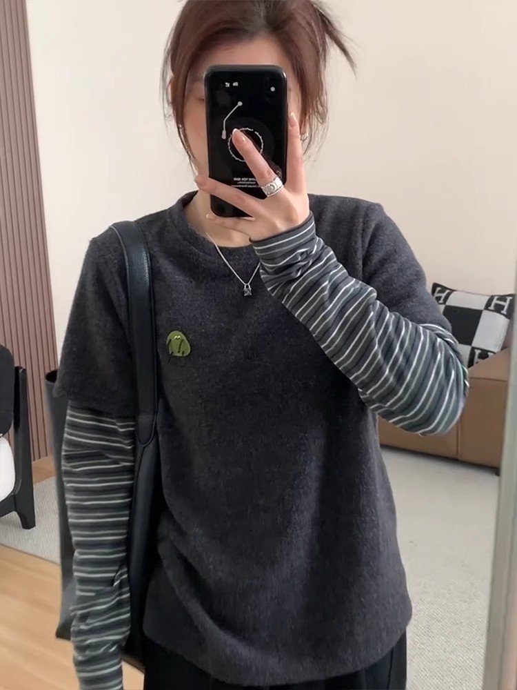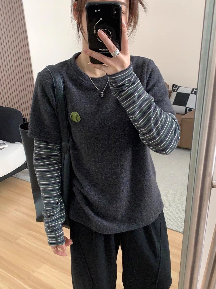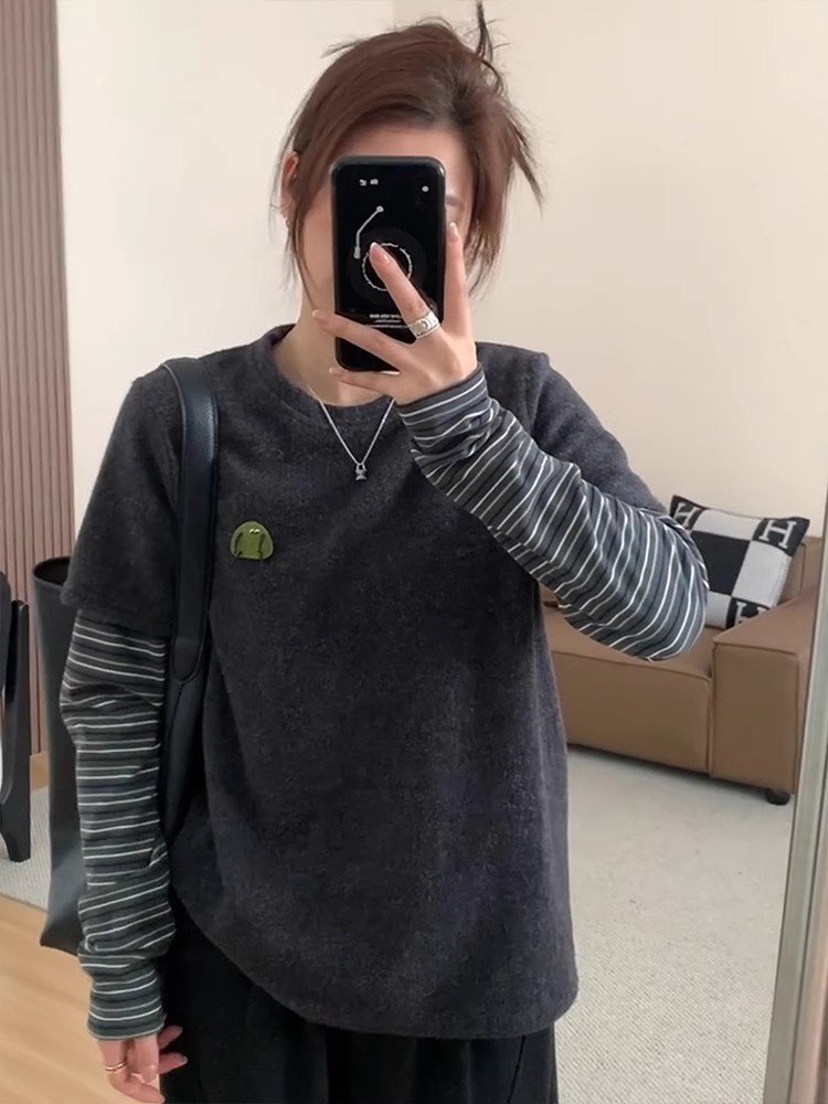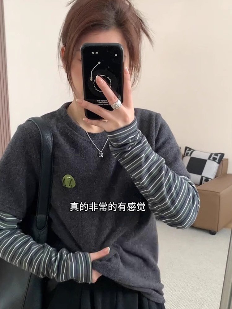 韩系灰色假两件正肩长袖t恤女春秋小众打底
