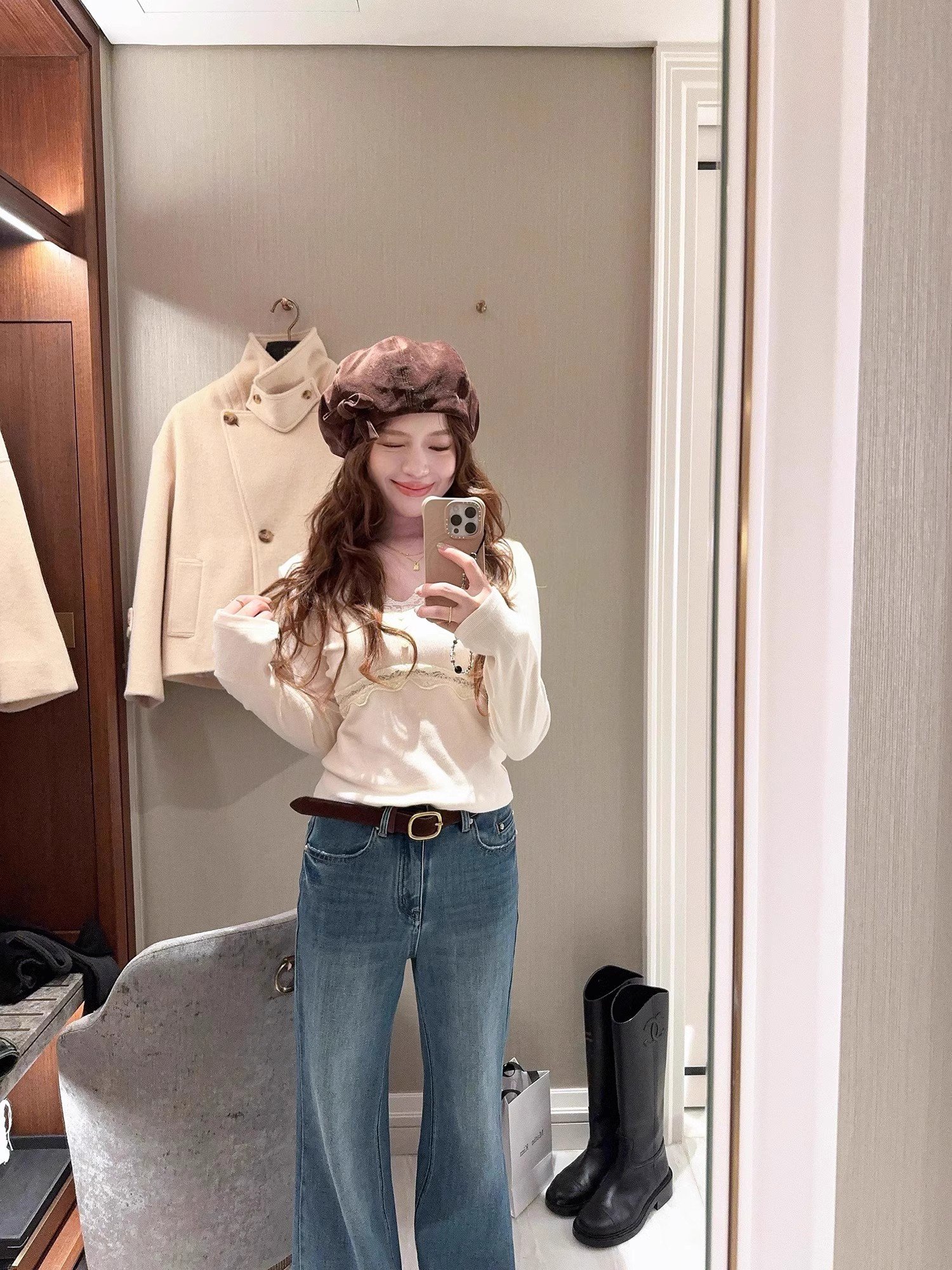 杏色内搭蕾丝v领长袖正肩t恤女春秋小个子