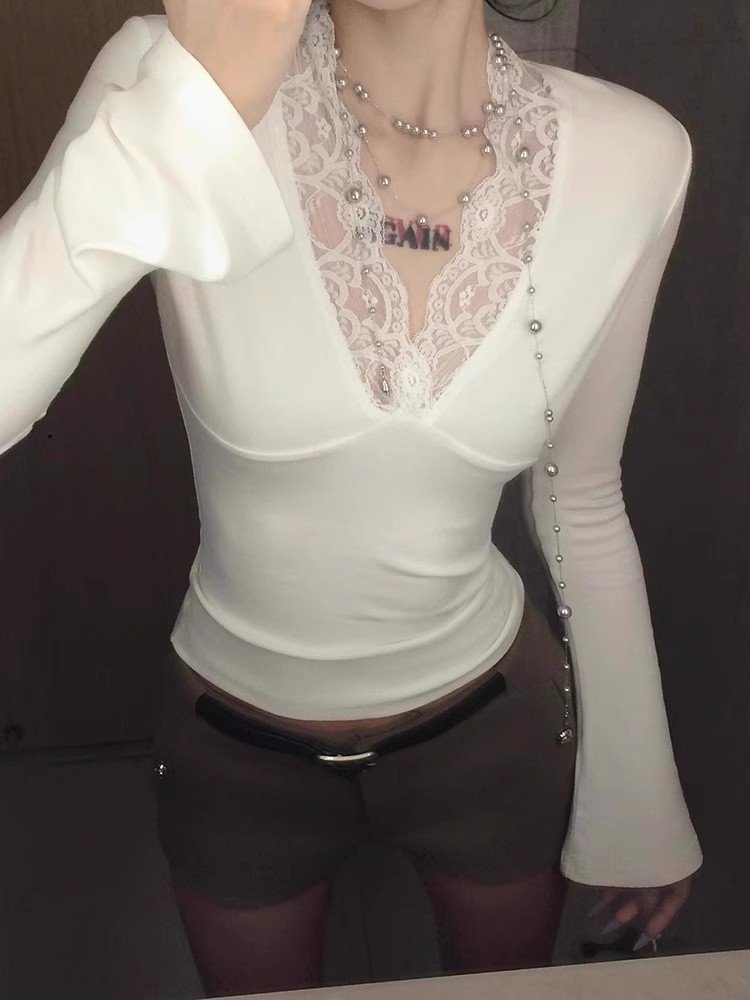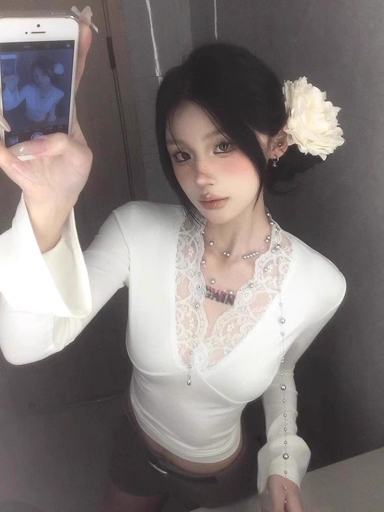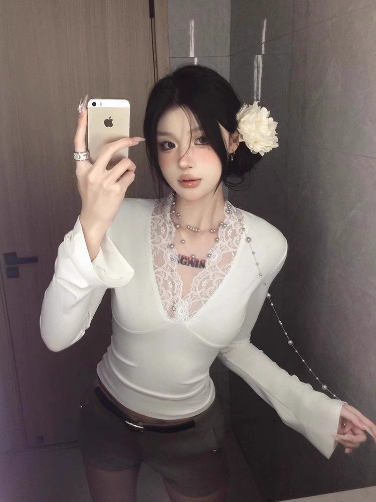 纯欲白色v领蕾丝长袖t恤女早春秋季小个子