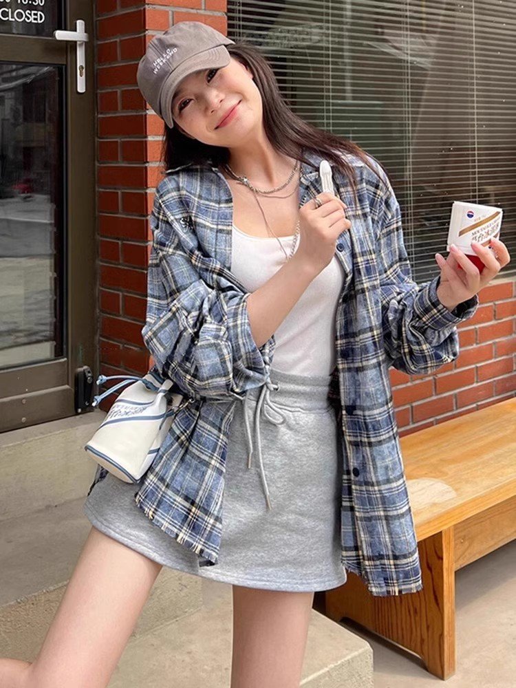蓝色格子衬衫外套女装2025春季新款衬衣