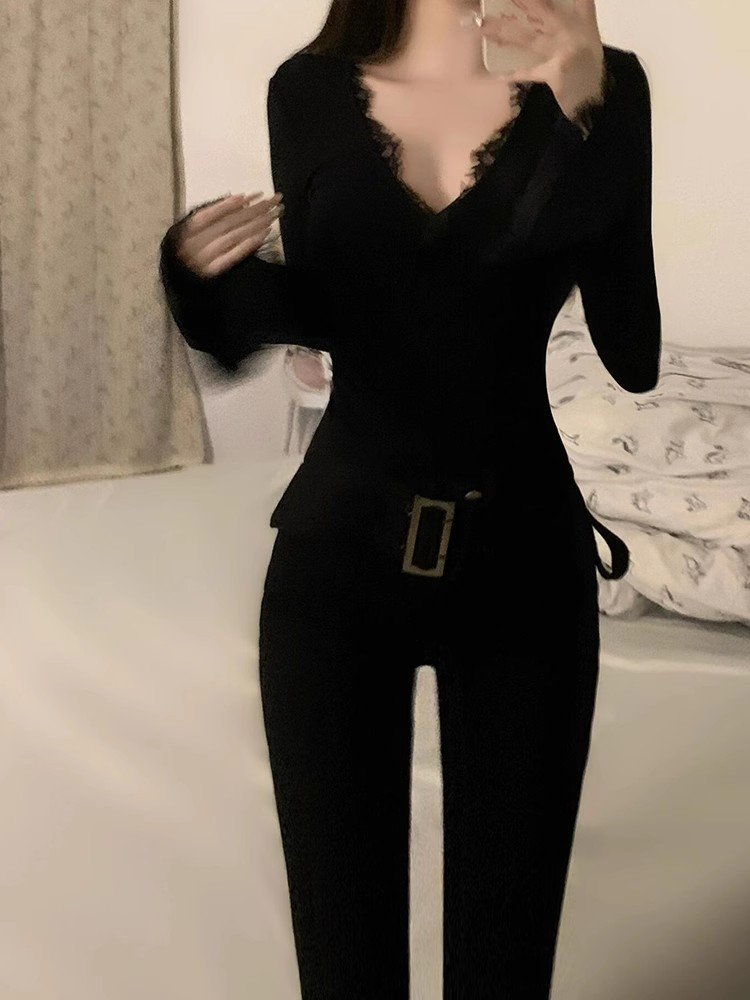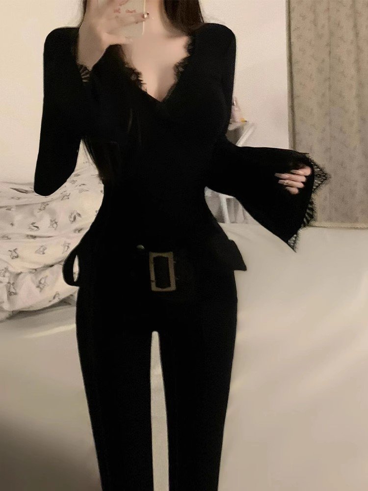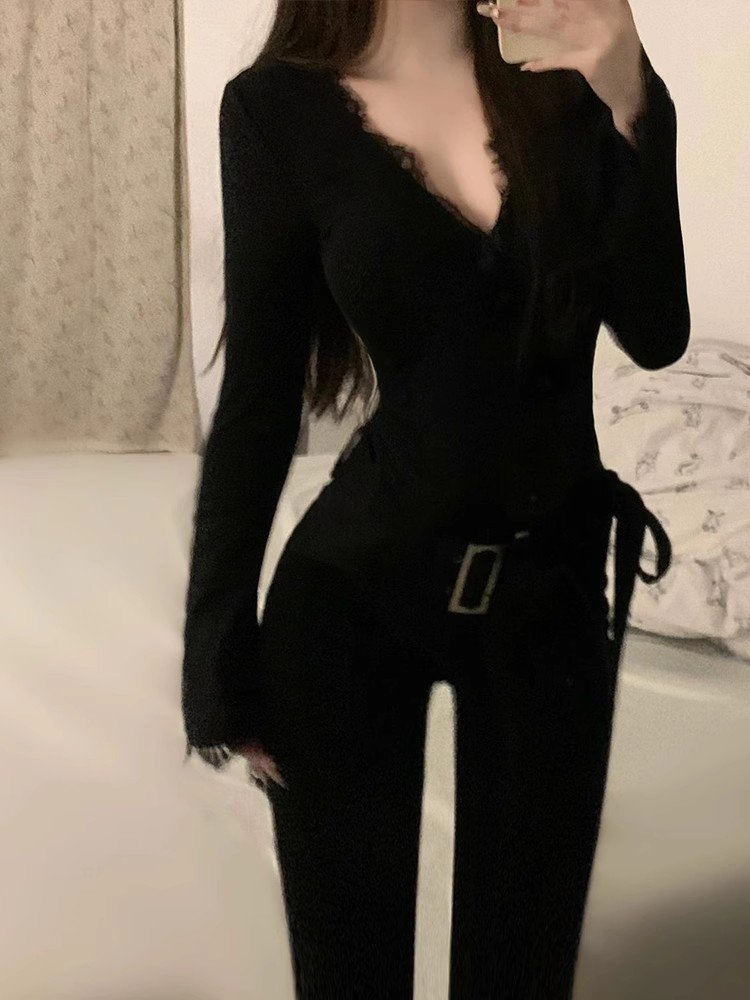 黑色内搭纯欲蕾丝v领长袖t恤女秋冬季加绒