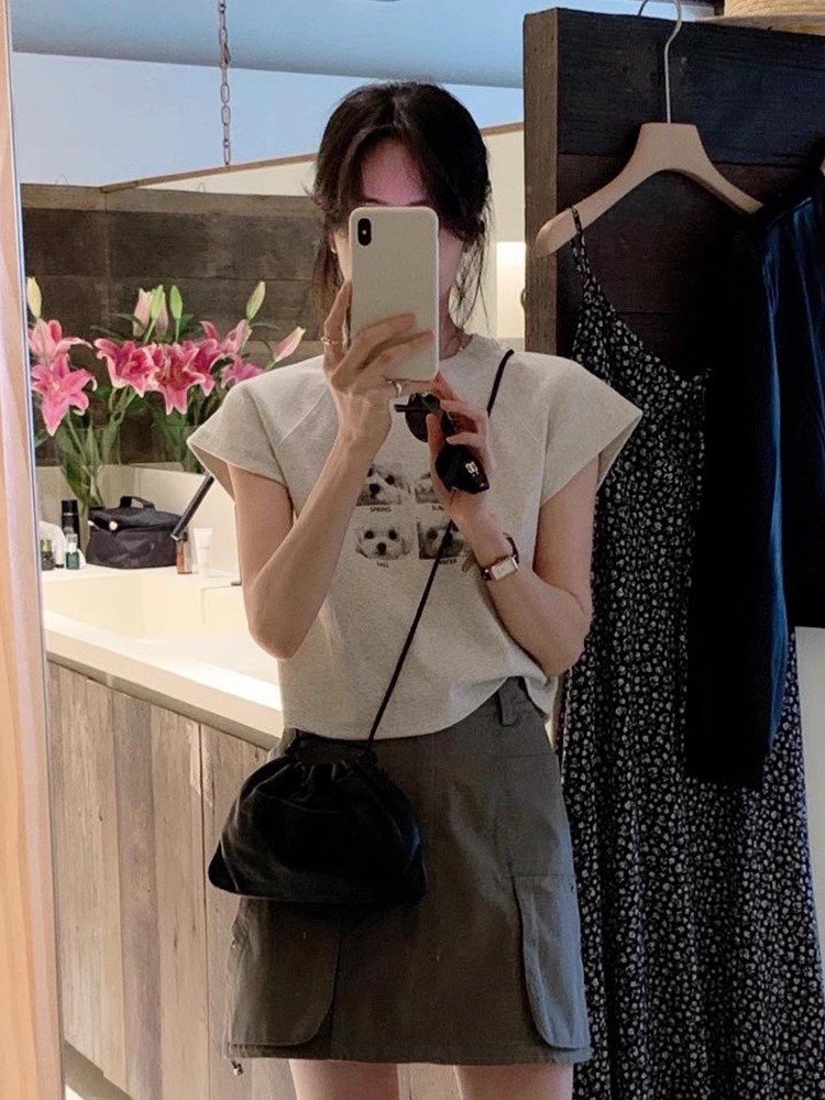 韩系短款灰色卡通印花短袖t恤女夏季小众设