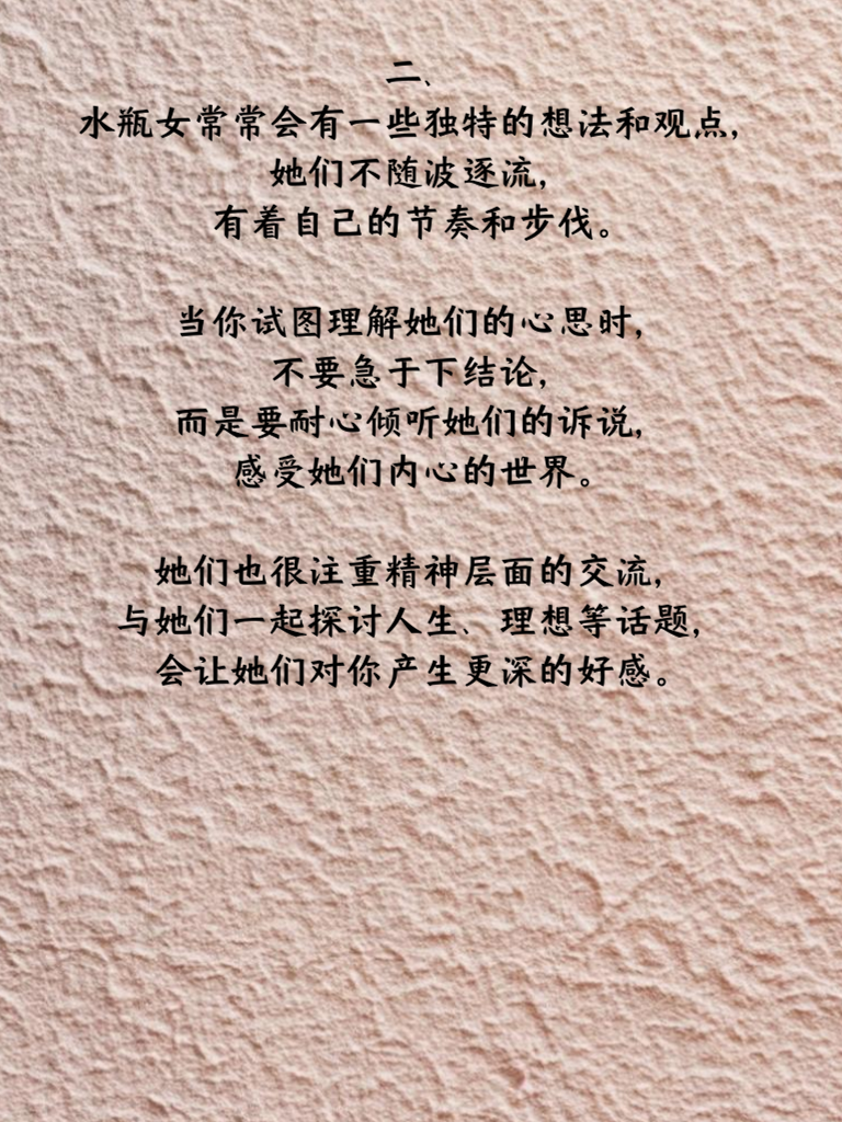 一、水瓶女的心思就像那变幻莫测的星辰,难以捉摸却又充满神秘。她们看似冷静理智,实则内心细腻敏感,一个细微的举动都可能在她们心中掀起波澜。她们喜欢追求自由和独立,不喜欢被束缚,所以在与水瓶女相处时,要给予她们足够的空间和尊重。 二、水瓶女常常会有一些独特的想法和观点,她们不随波逐流,有着自己的节奏和步伐。当你试图理解她们的心思时,不要急于下结论,而是要耐心倾听她们的诉说,感受她们内心的世界。她们也很注重精神层面的交流,与她们一起探讨人生、理想等话题,会让她们对你产生更深的好感。 三、然而,水瓶女也有她们脆弱的一面。在面对感情问题时,她们可能会显得有些彷徨和不安。这时候,作为男生,你要给予她们足够的关心和支持,让她们感受到你的温暖和力量。用真诚去打动她们,用行动去证明你的爱,相信你一定能够走进水瓶女的内心世界,与她们共同创造美好的未来。