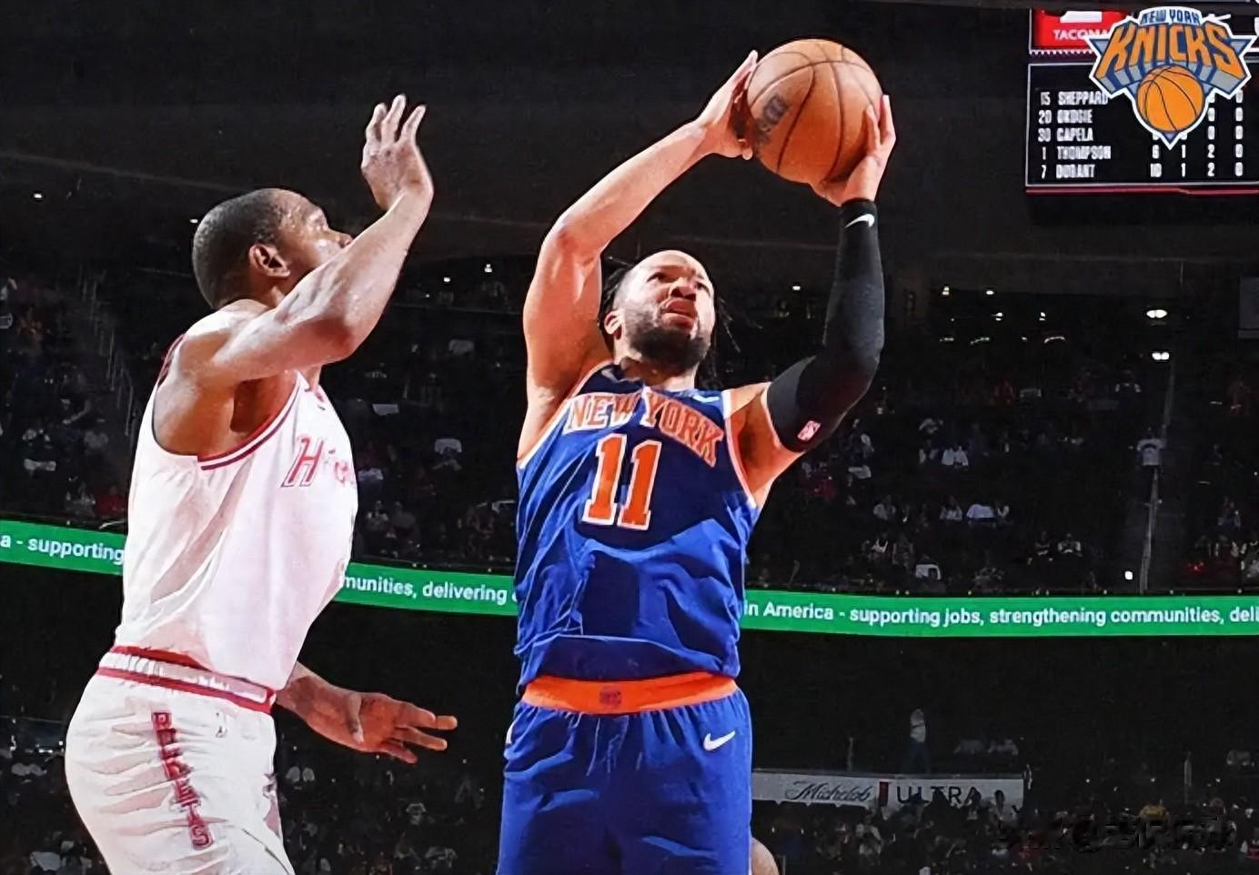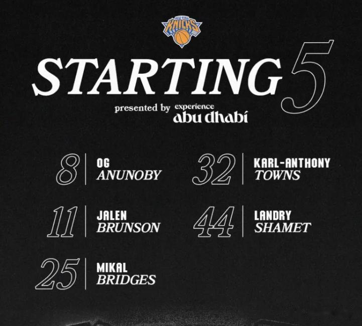 首发阵容方面,尼克斯队这边,沙梅特因膝盖伤势确定缺席,教练排出的首发五人组为:布伦森、哈特、布里奇斯、阿奴诺比、唐斯;火箭这边,范弗里特(膝盖)赛季报销、亚当斯(脚踝)赛季报销,首发阵容则为:阿门-汤普森、伊森、杜兰特、小贾巴里-史密斯、申京。