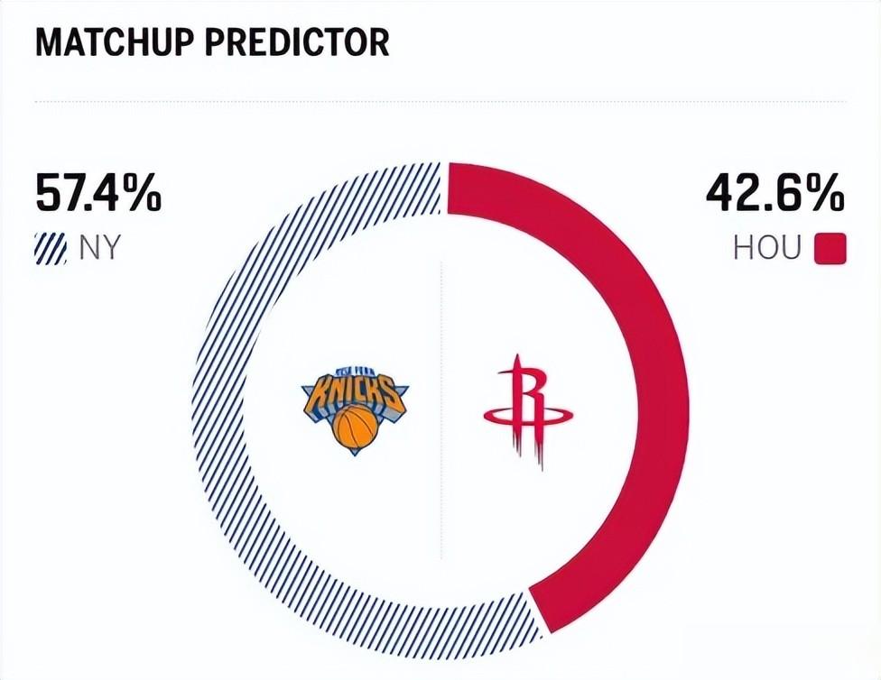 赛前,美媒ESPN对本场比赛进行了胜率预测,尼克斯队胜率57.4% ,略占优势,火箭胜率则仅有42.6% 。